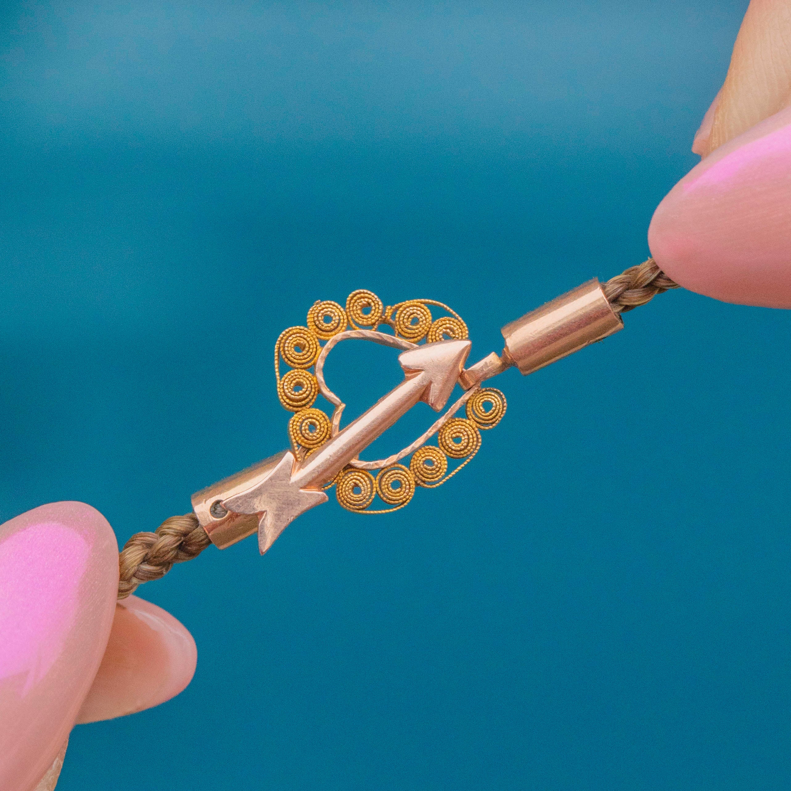 EXCELLENT. This exquisite Victorian mourning hair necklace is in stunning condition. The locket gleams a rosy Gold hue with minimal signs of wear, while the finely woven mourning hair remains beautifully intact and tightly woven. The pierced heart clasp is both secure and charming, steeped in significant history, this piece is a true collectible.