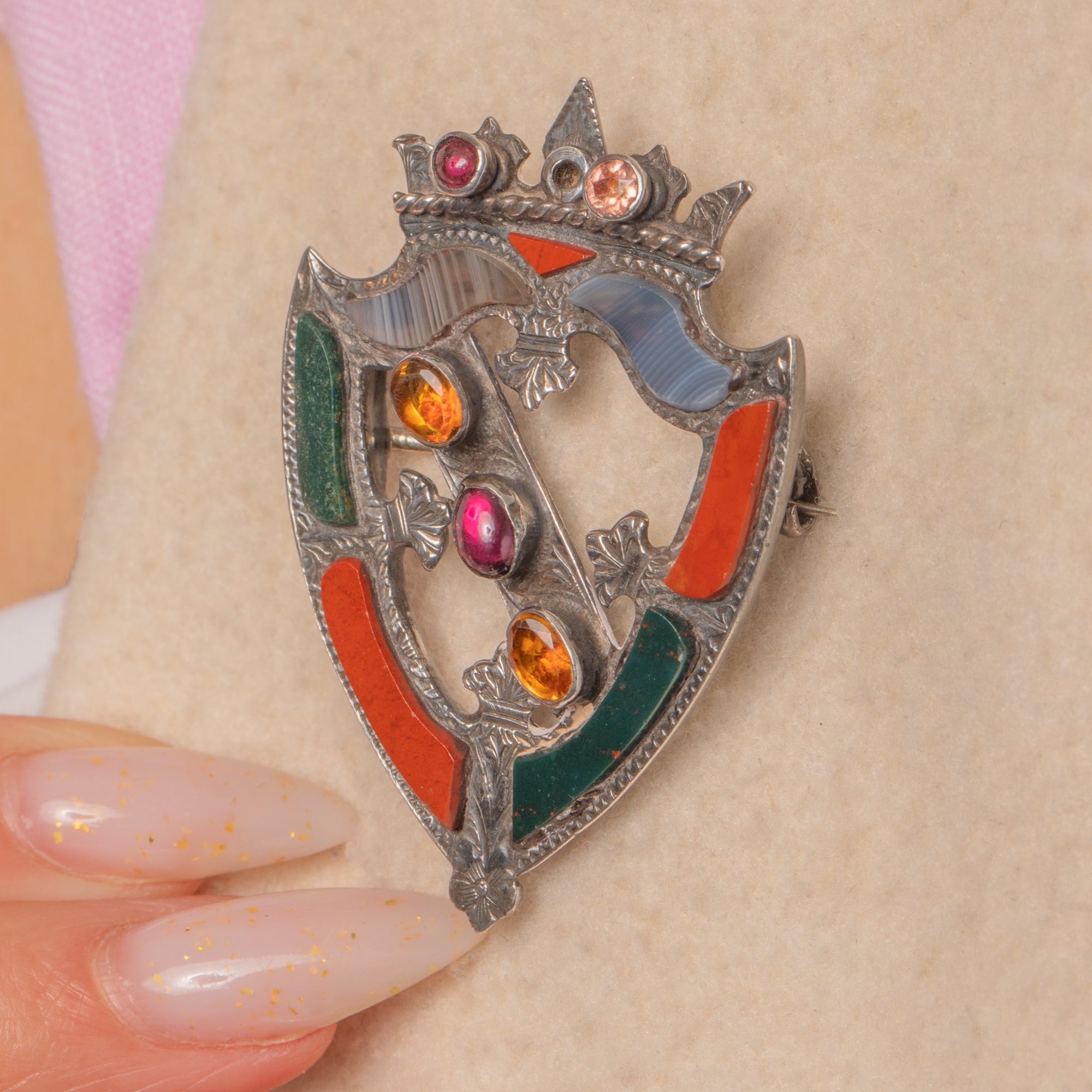 A striking Victorian Scottish “pebble” shield brooch, this crowned heraldic design is richly detailed in Sterling Silver with crisp engraving, thistle-like flourishes and beaded borders. Segmental inlays of Agate, Bloodstone and Carnelian trace the perimeter with beautiful natural colour, while a diagonal band is set with gleaming Citrines and a central Garnet for a bold pop of jewel tones.