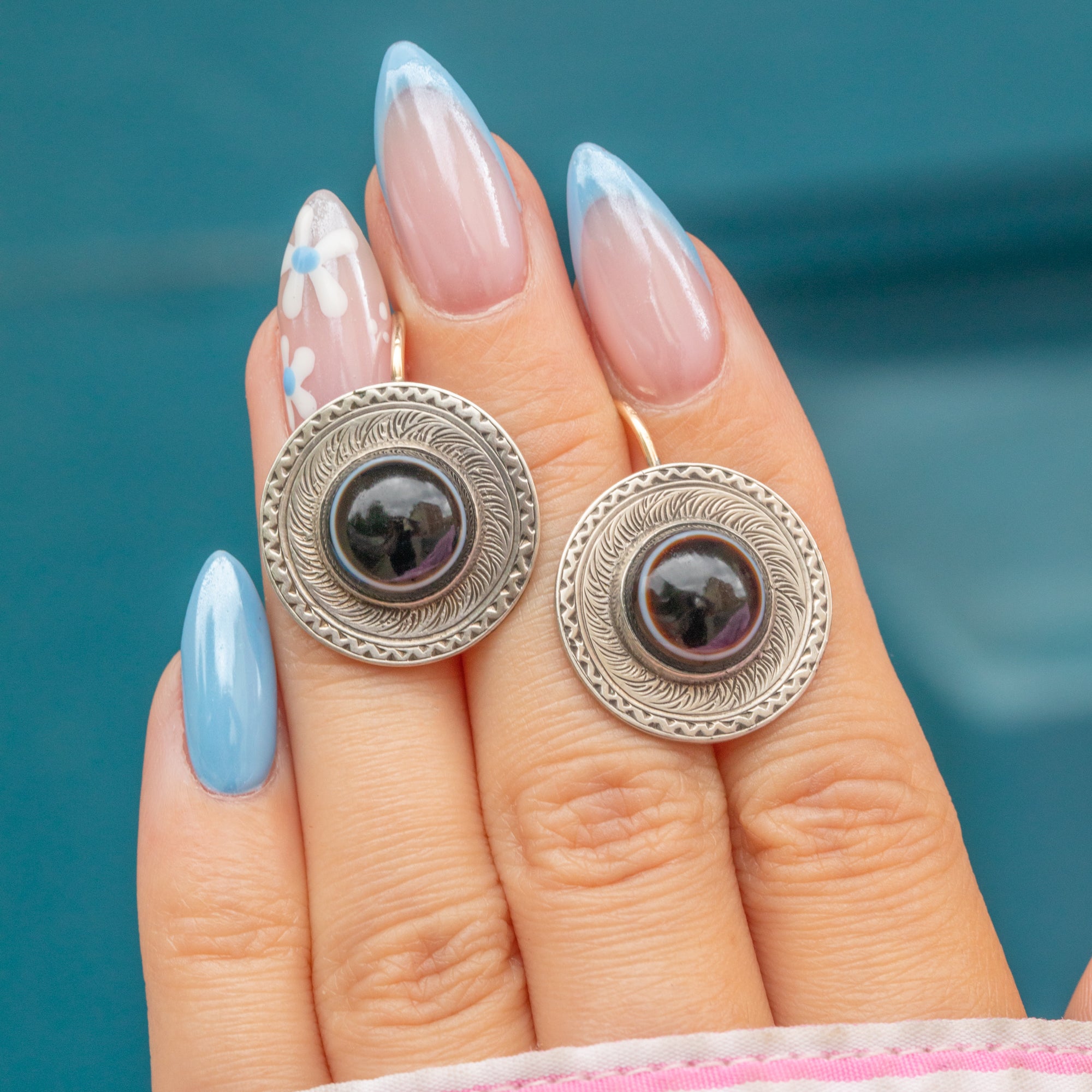 Boasting character and antique charm, this pair of Victorian earrings each presents a plump banded Agate with a white band running the circumference of the stone - akin to a bullseye.