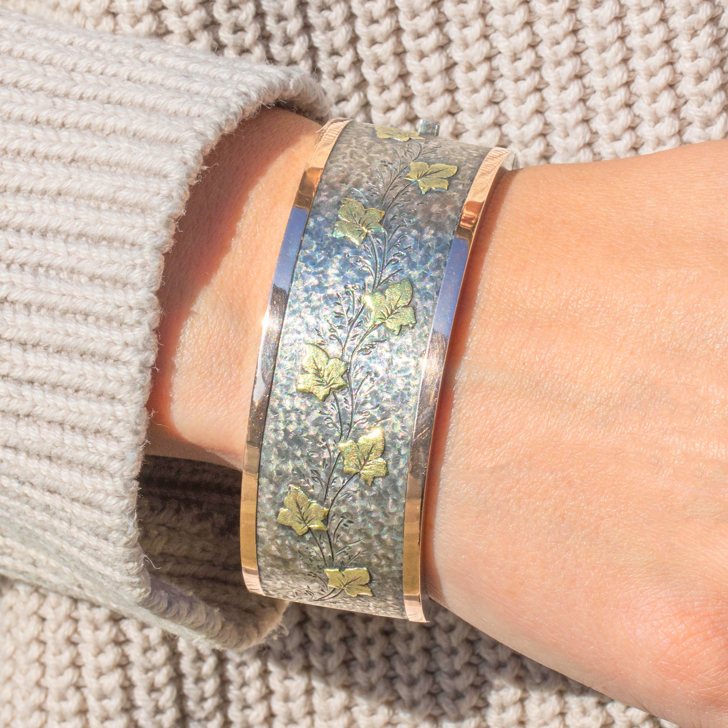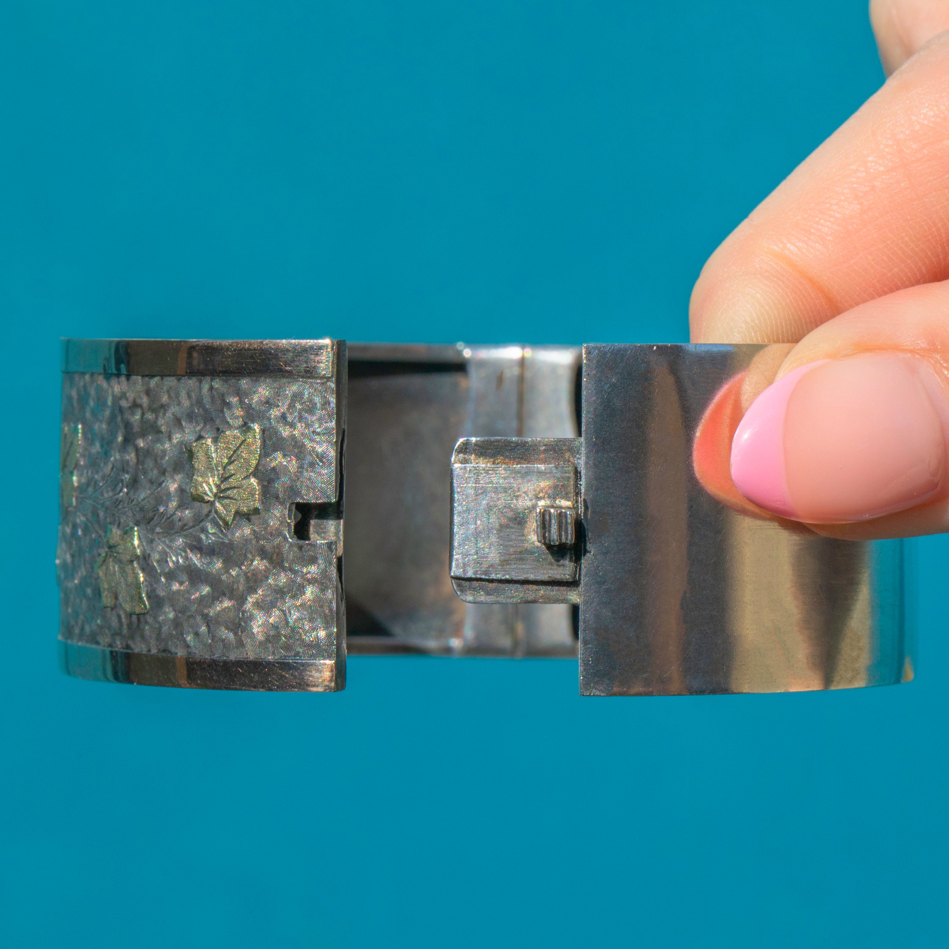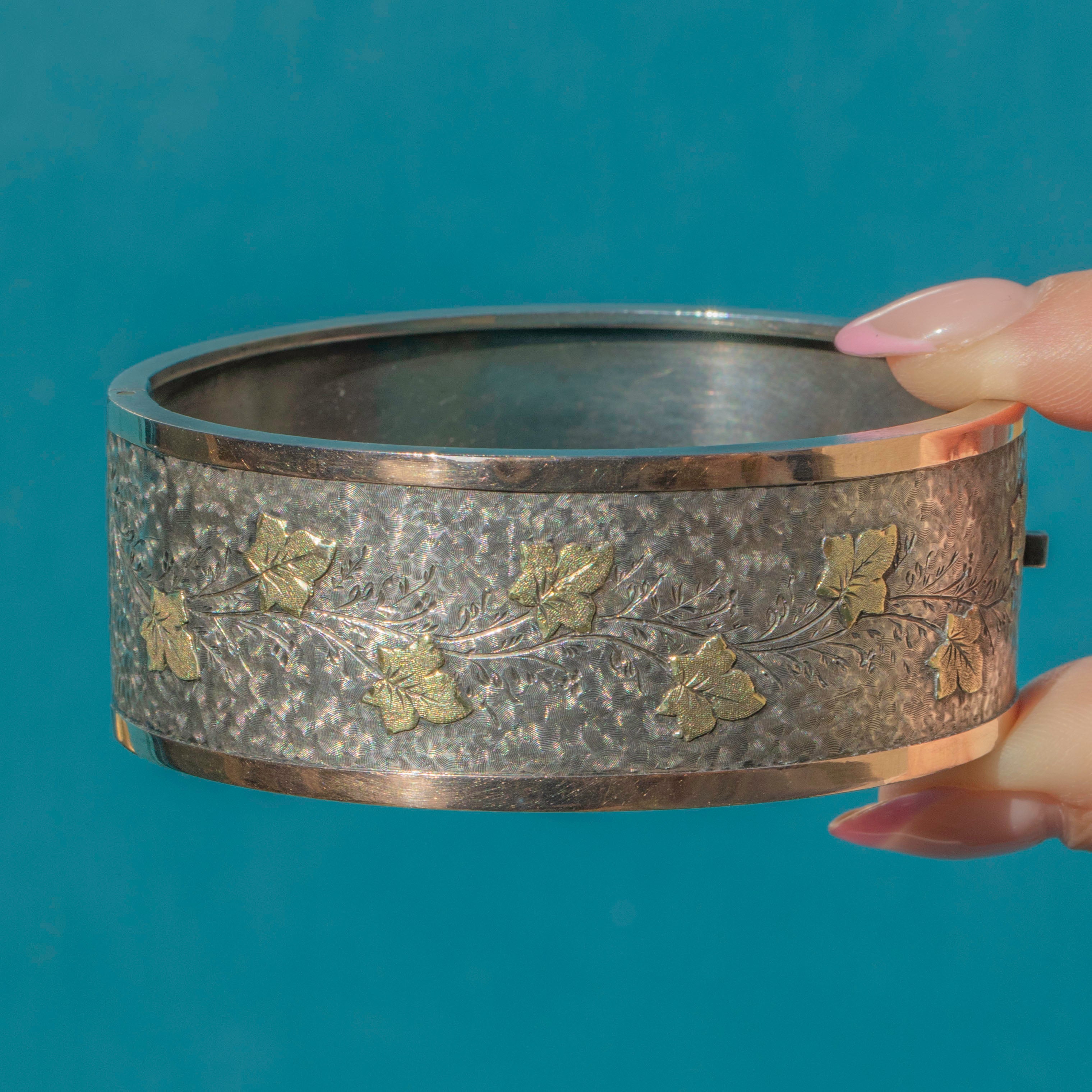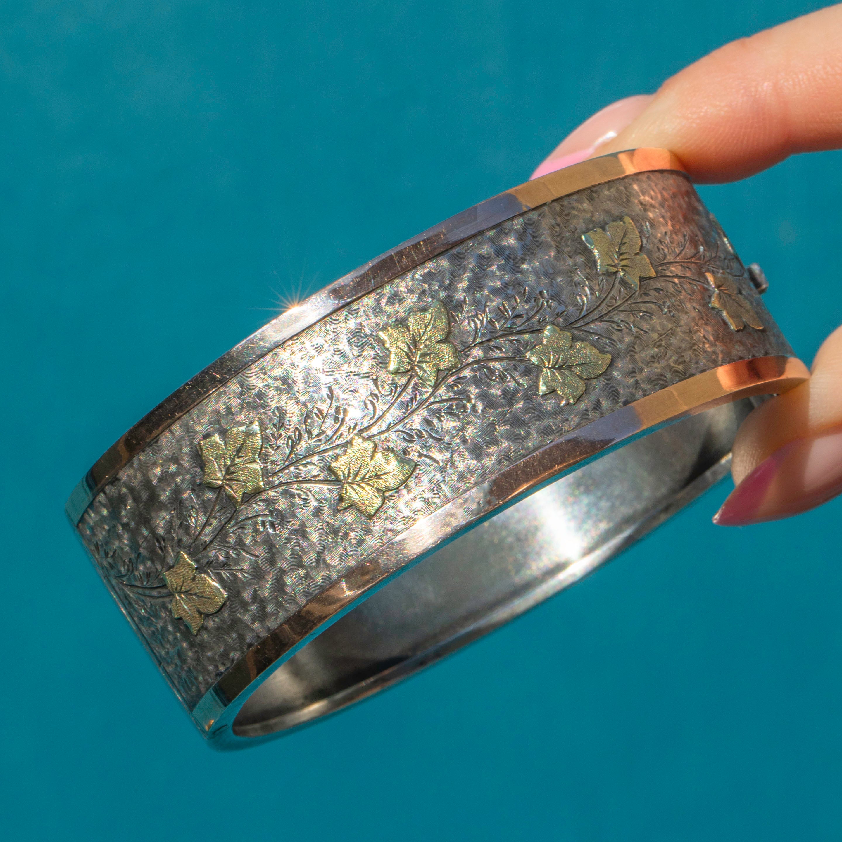This Victorian Silver engraved bangle is simply sublime! Whimsical ivy vines follow the circumference of your wrist, with her ivy leaves formed of textured and rare green Gold. Contrasting against a stippled sterling Silver background with a deep patina, the Gold accents pop making a statement on the wrist.