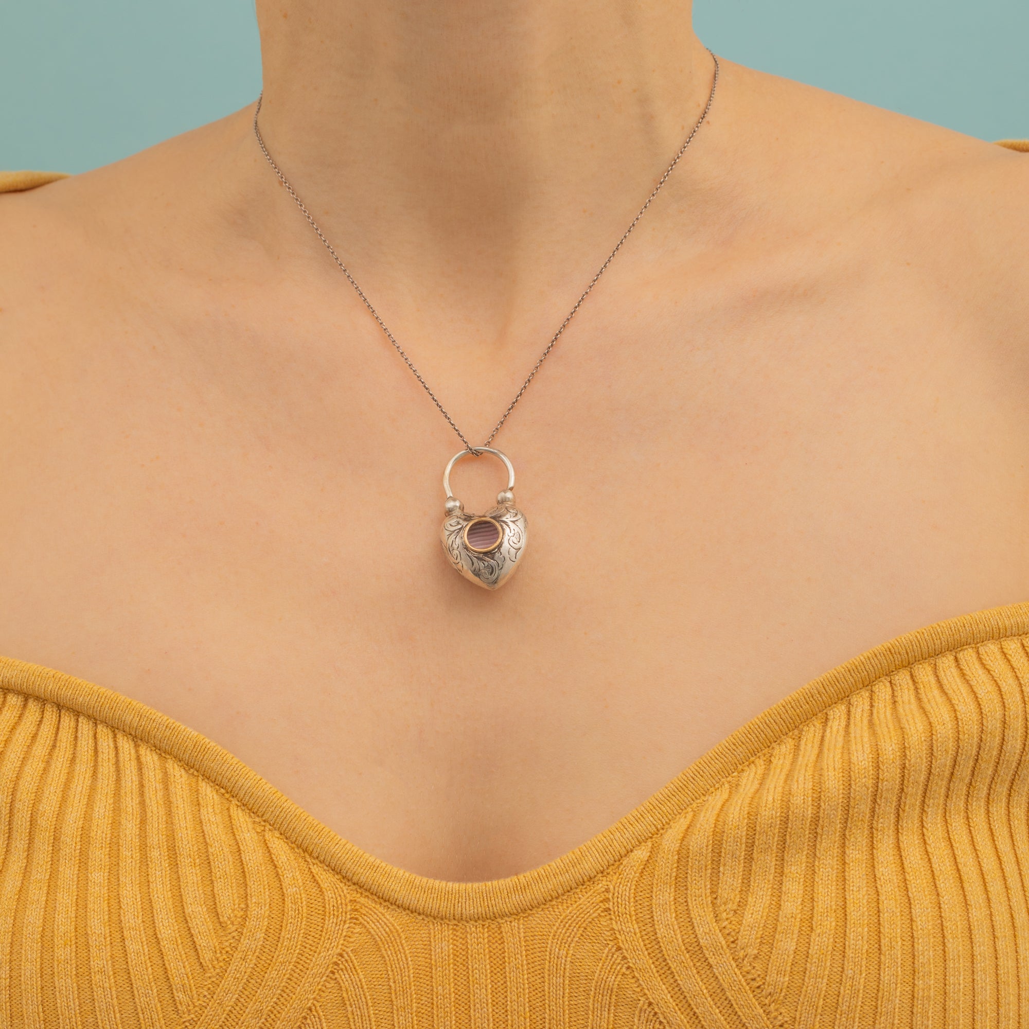 This sweet Victorian Silver engraved puffy heart padlock pendant will make a lovely addition to your collection! Beautifully designed, this puffy padlock has been engraved on both its front and back, with a secret locket compartment that is only revealed once you turn it around!
