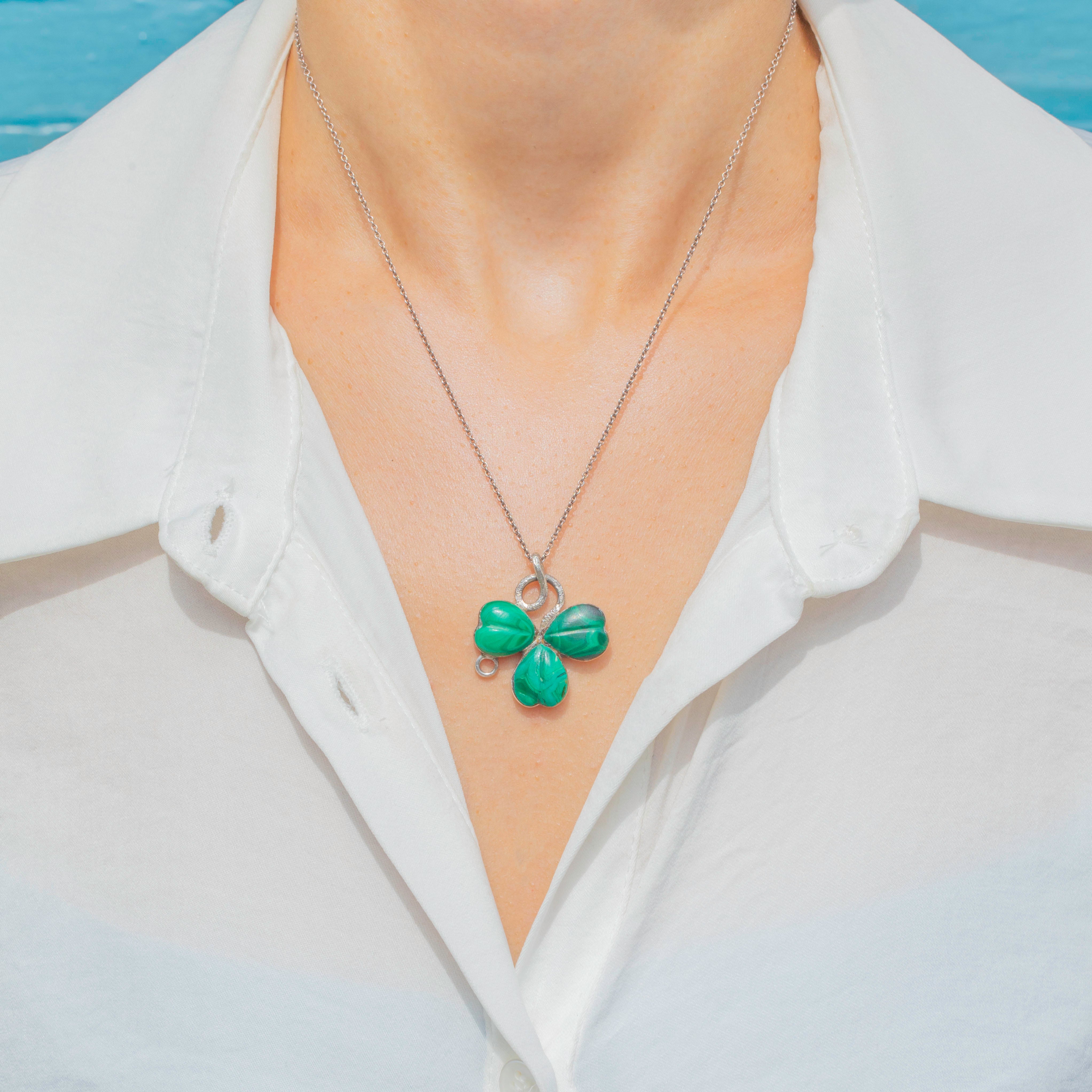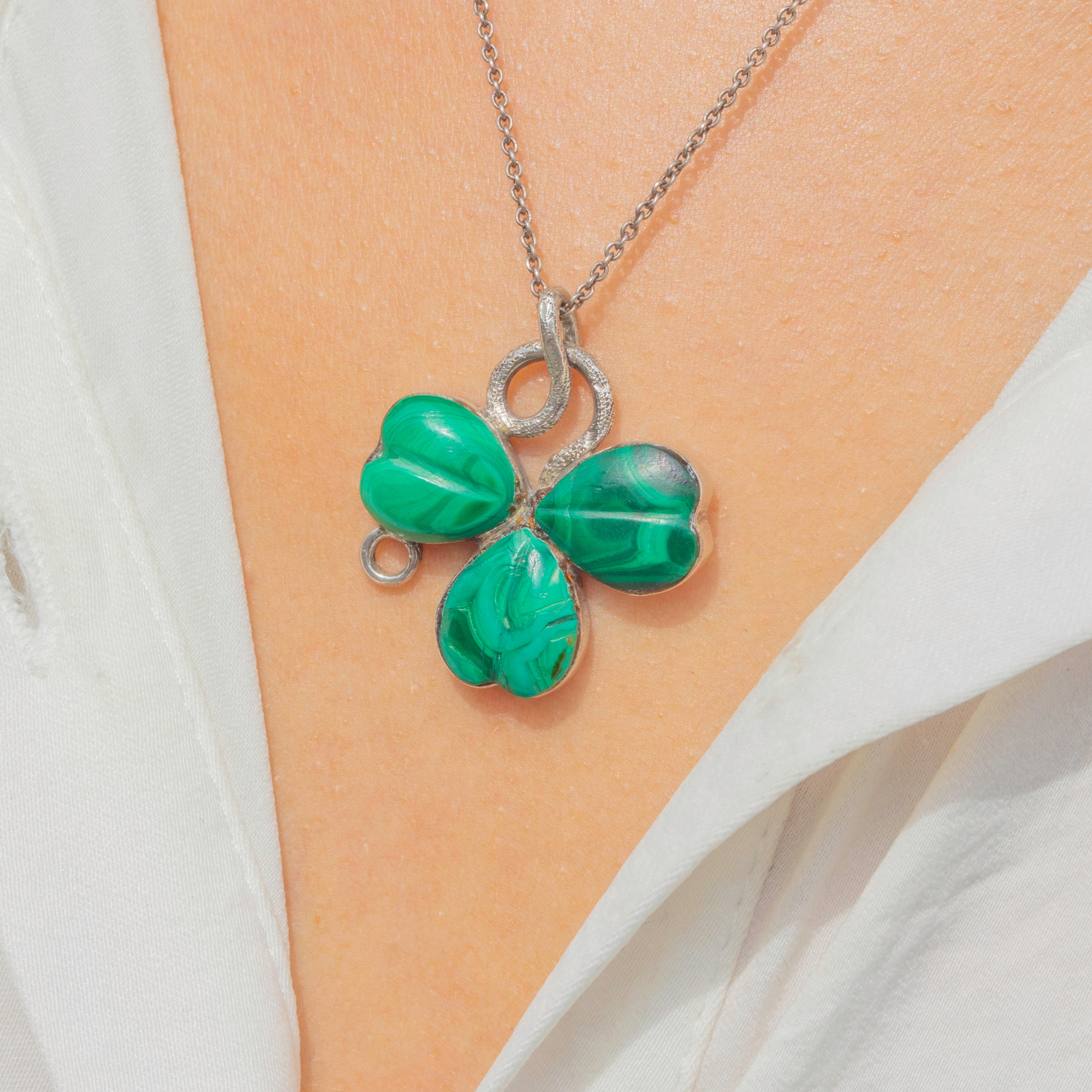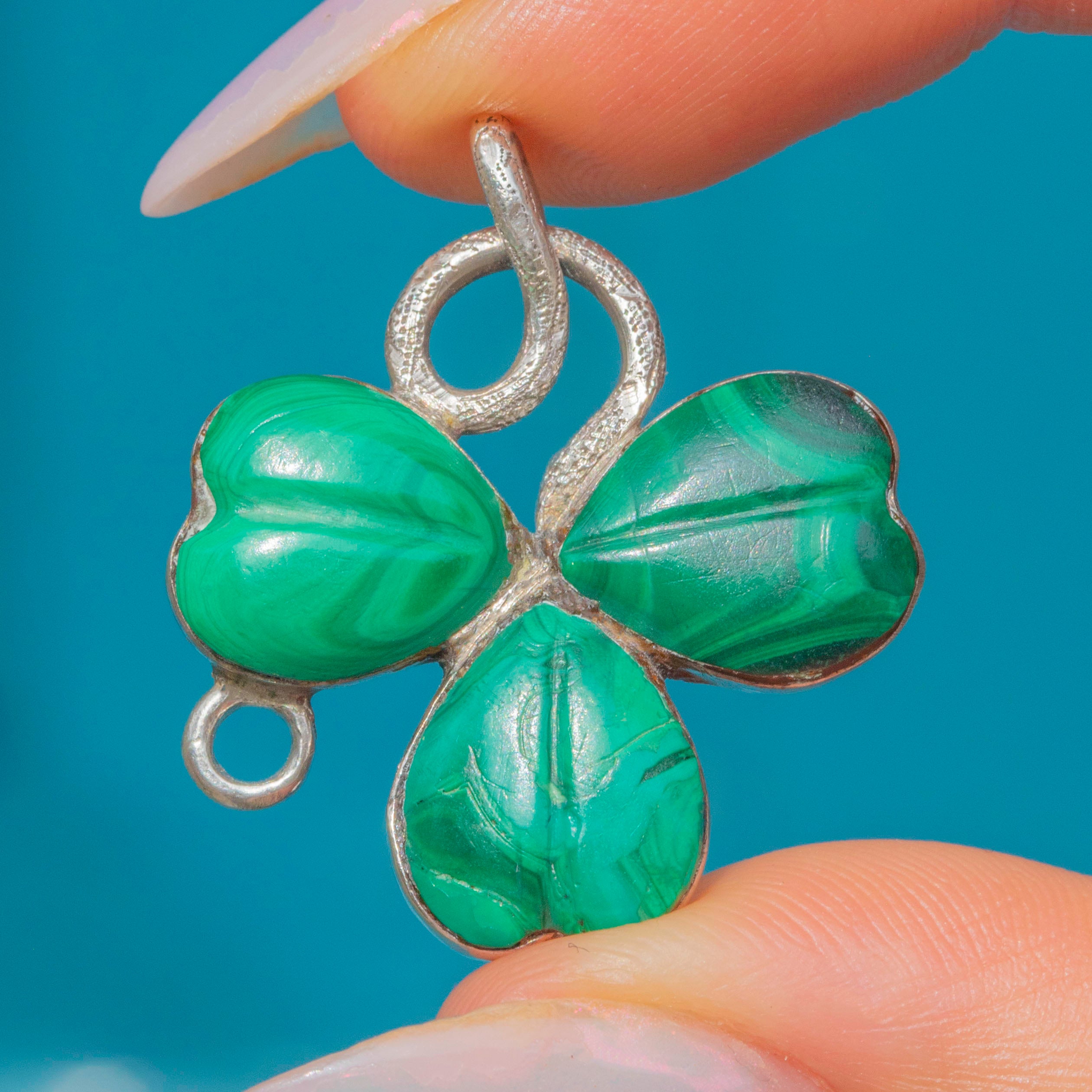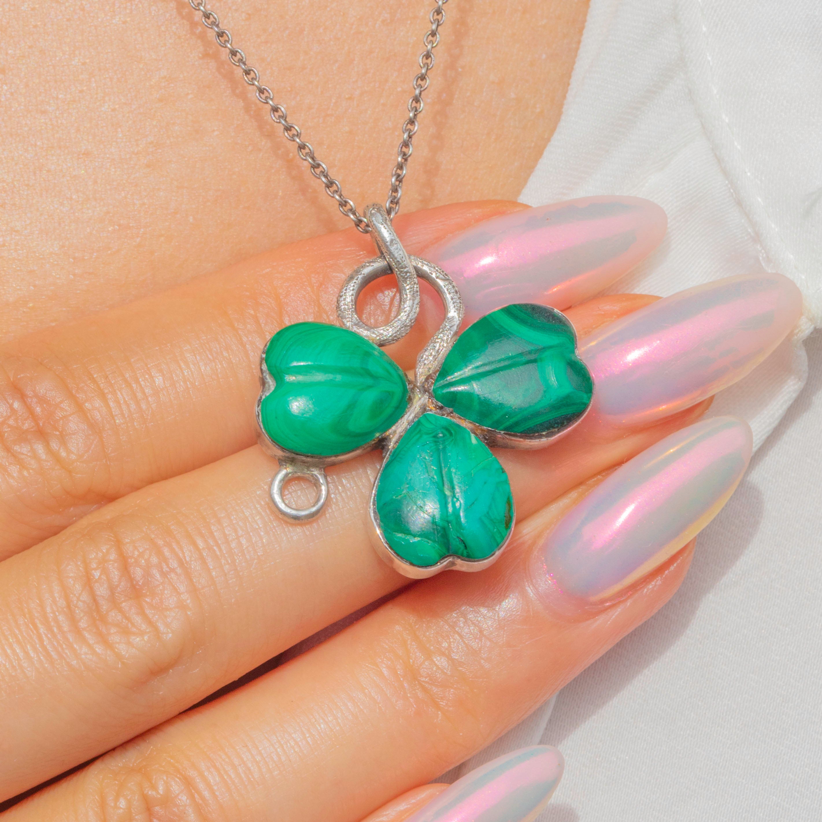 This Victorian clover pendant features vibrant green Malachite leaves set in Silver with a whimsical tendril bale.