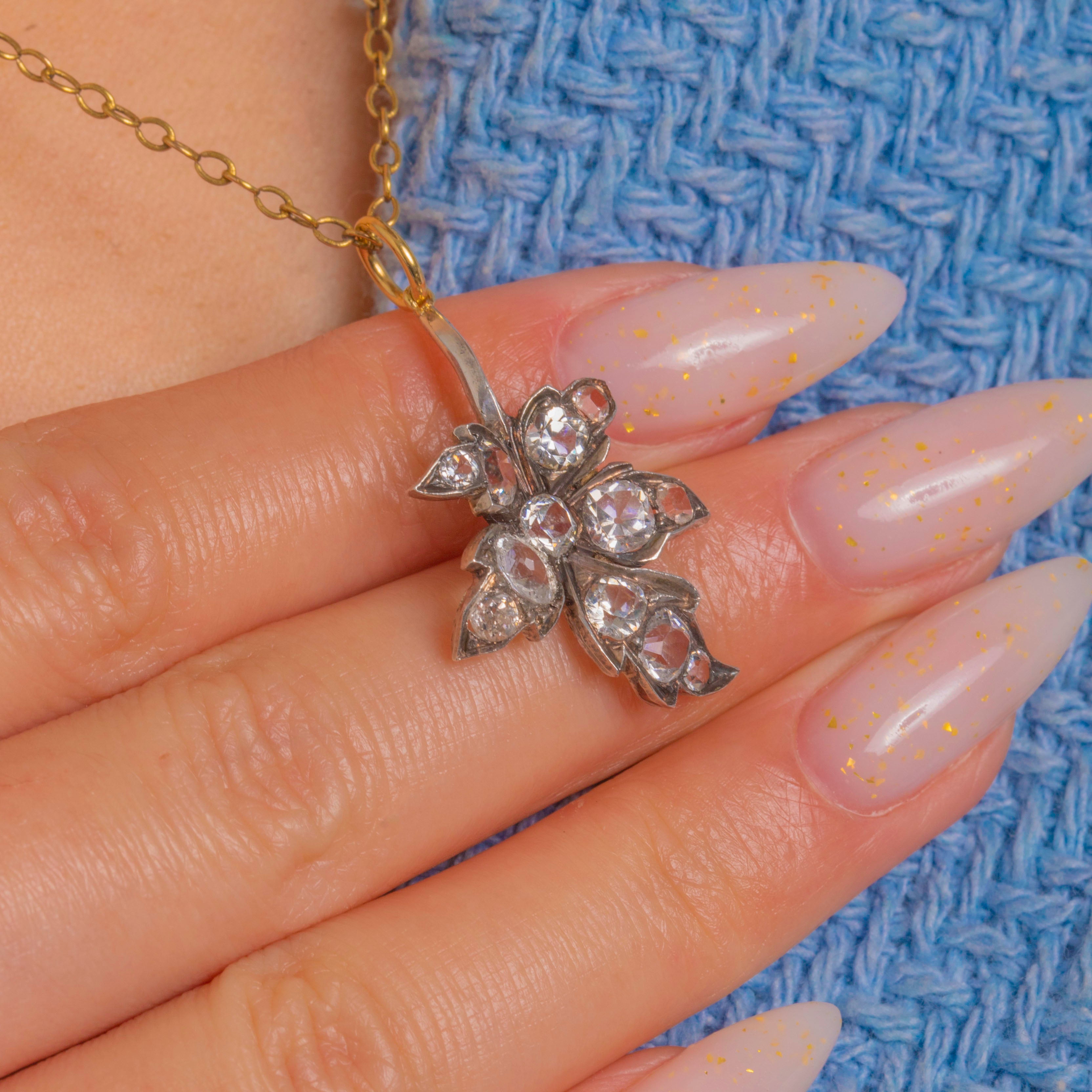 Crafted in Silver with an 18ct Gold layer to the back and finished with an 18ct Gold hasp and jump ring, it wears a timeless two-tone allure so characteristic of the period. Once a brooch and now a dainty pendant, it’s a charming slice of 19th-century elegance ready to grace any chain.