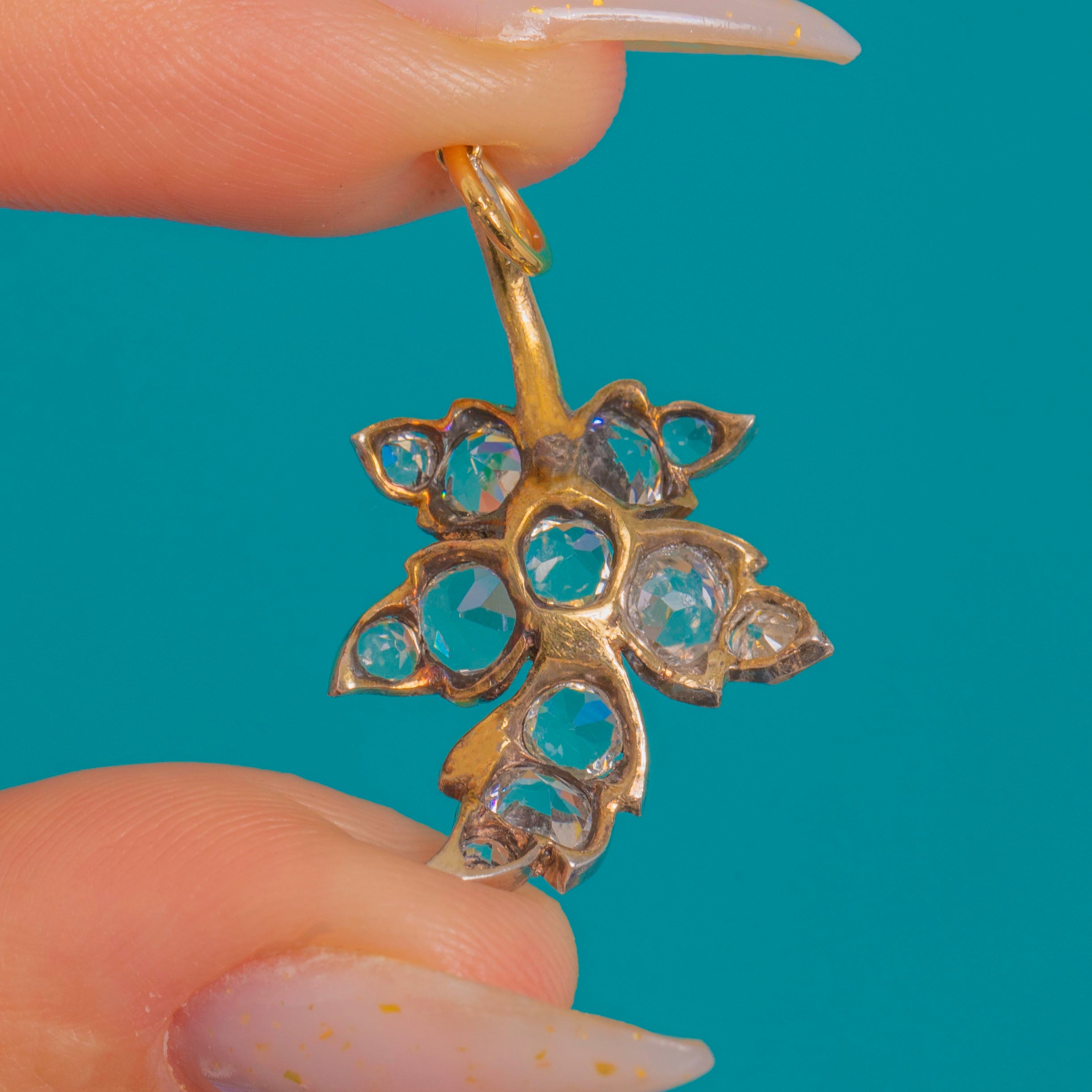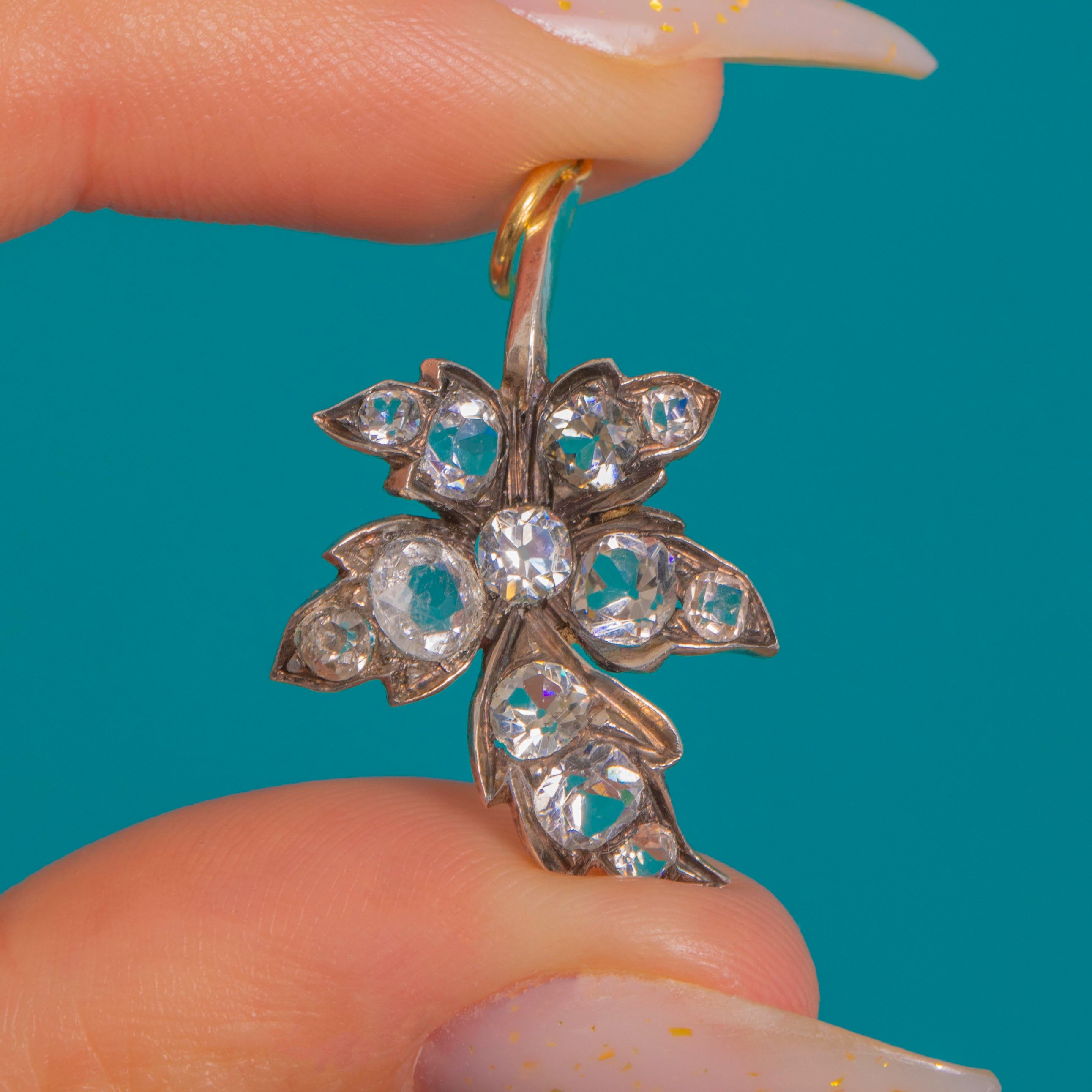 Delicate and romantic, this Victorian foliate charm blooms with sparkling Paste in sculpted settings, forming a petite leaf. The old-mine and old-European-cut stones catch the light beautifully, their antique faceting lending a soft, candlelit twinkle.