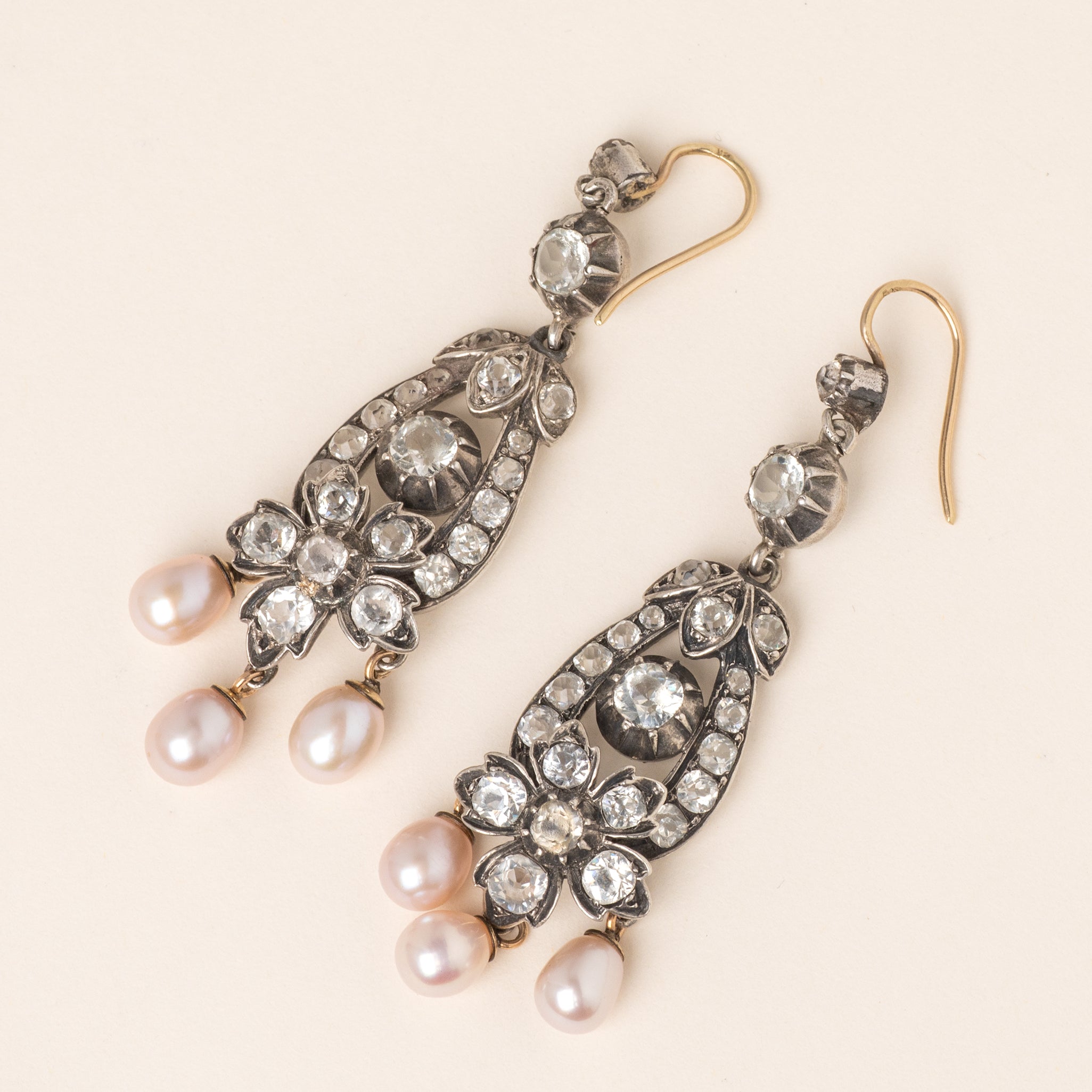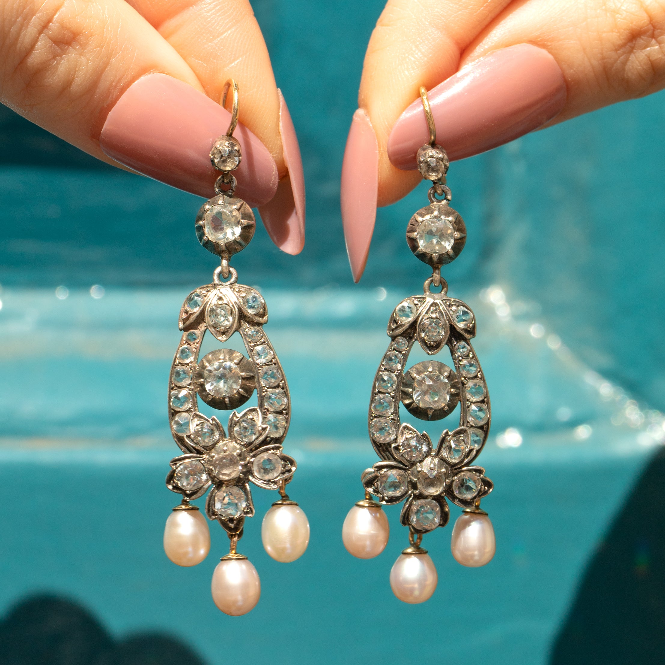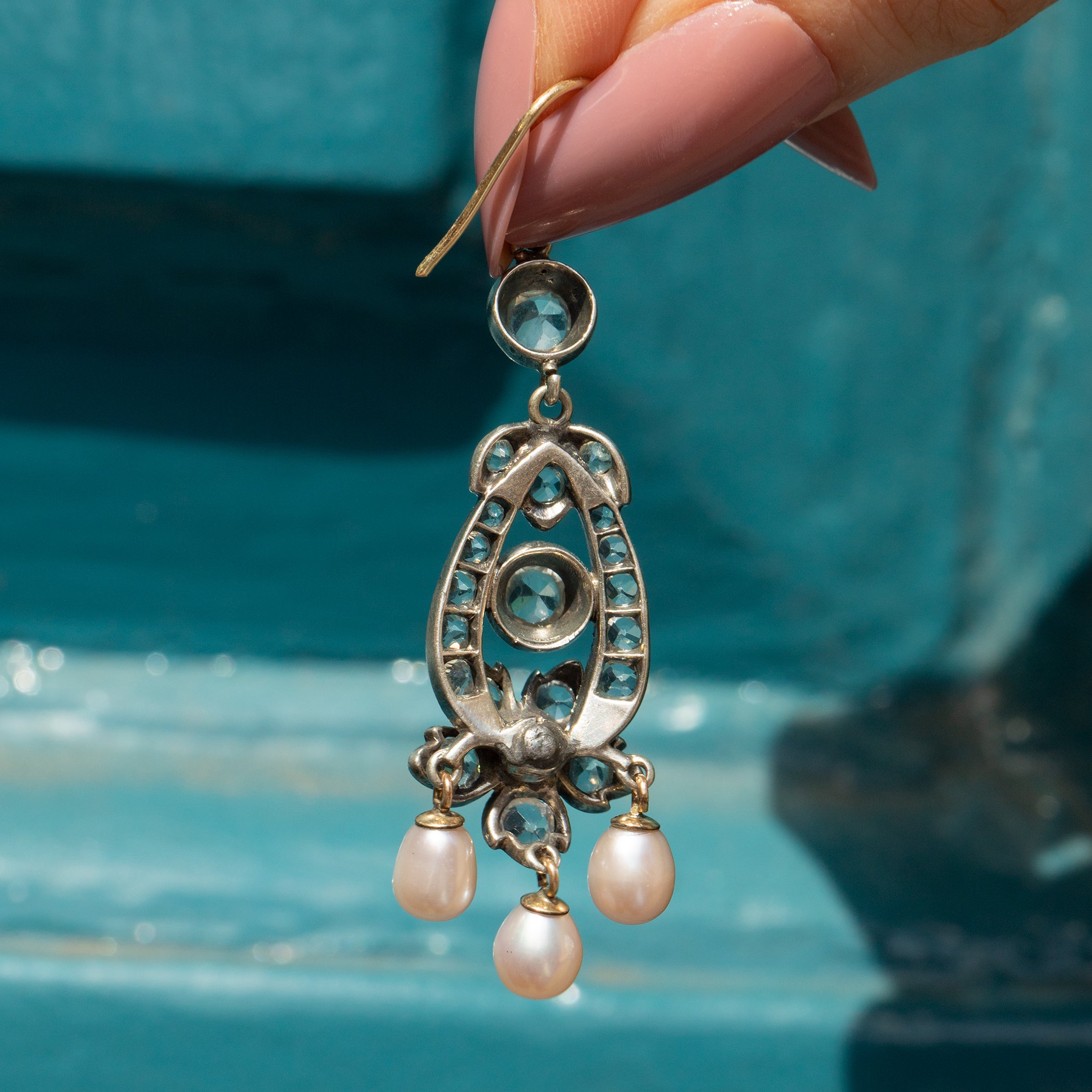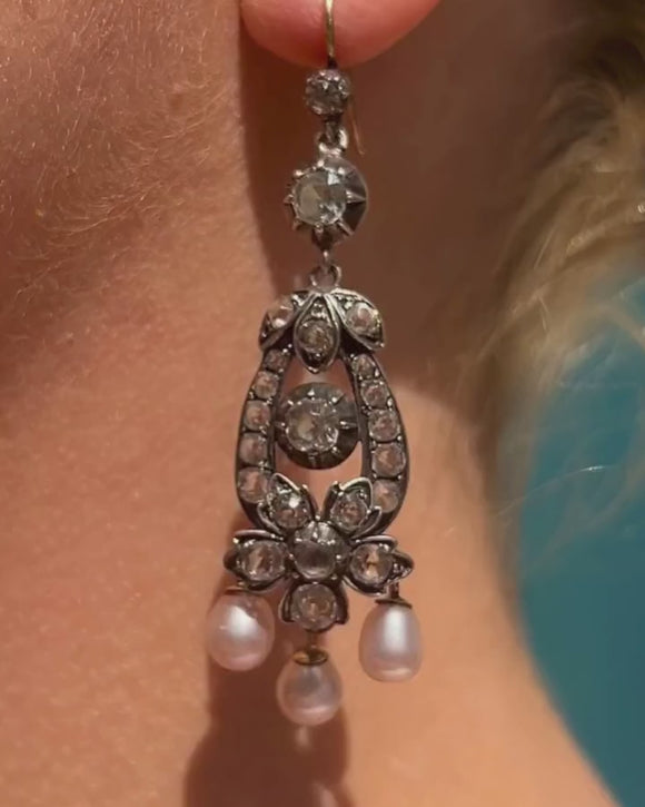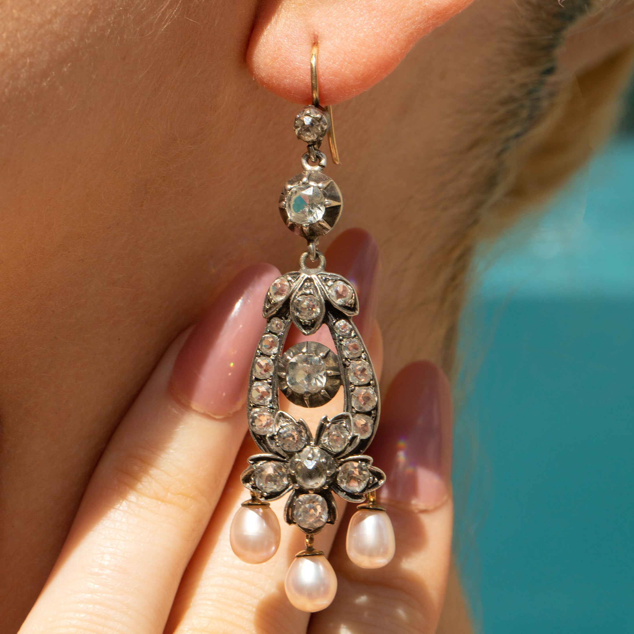 EXCELLENT. This pair of Victorian silver Paste & Pearl Girandole drop earrings are in excellent condition. The earrings have lasted very well through time, and although it is likely that the Pearls are a later replacement, they are in keeping with the design and look gorgeous on the ear. The Paste is lovely, and while some do have wear to note, they retain a fiery sparkle.
