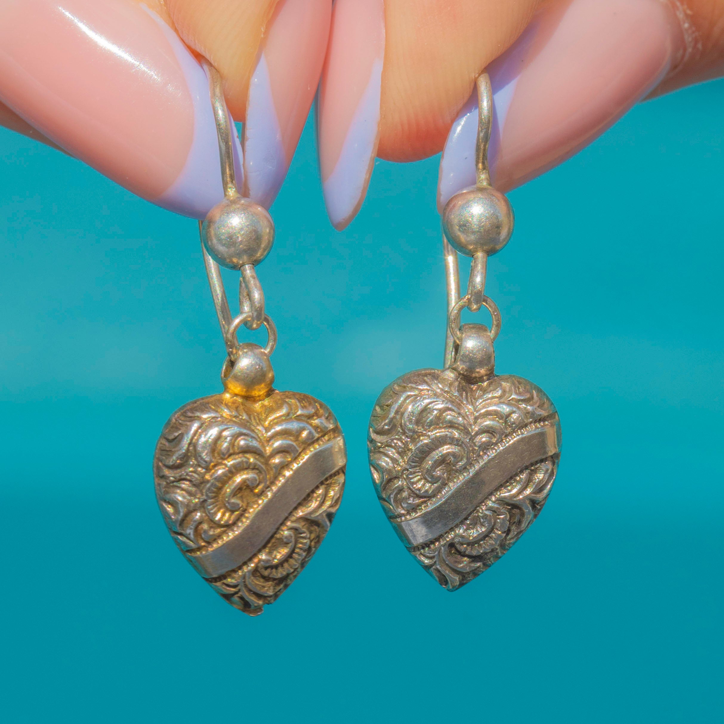 Victorian Silver Repousse Puffy Heart Drop Earrings