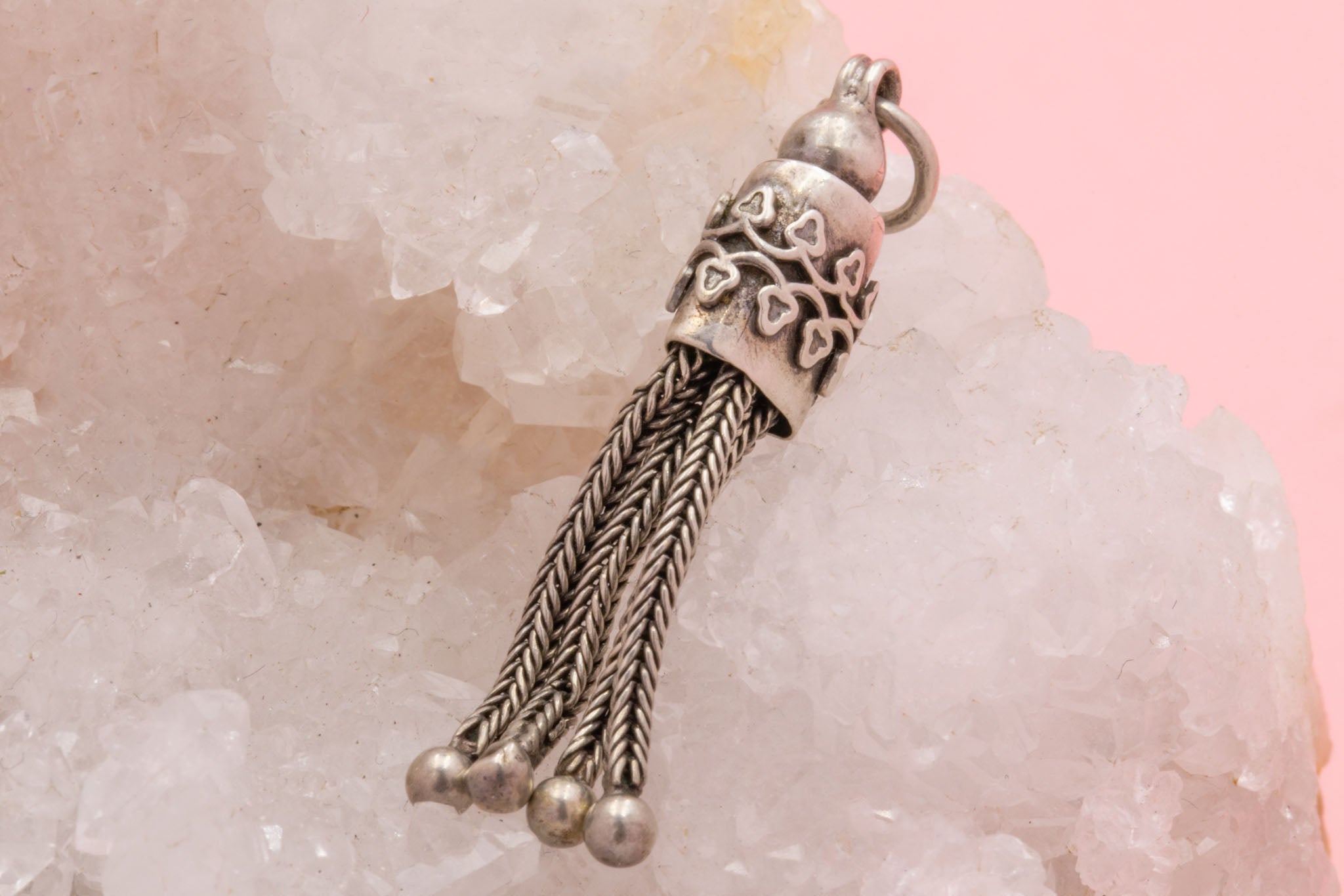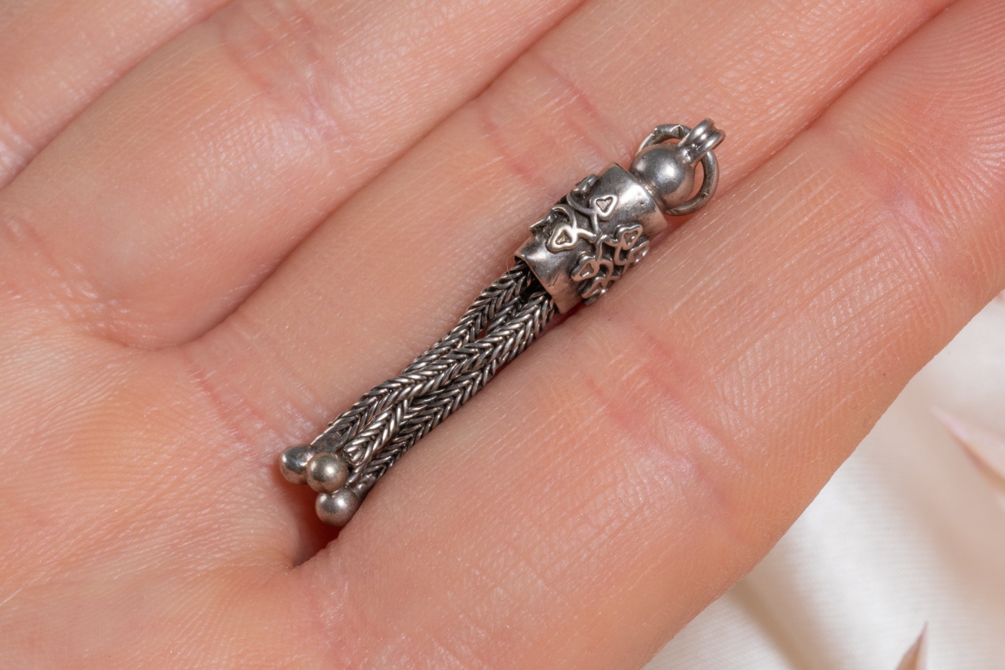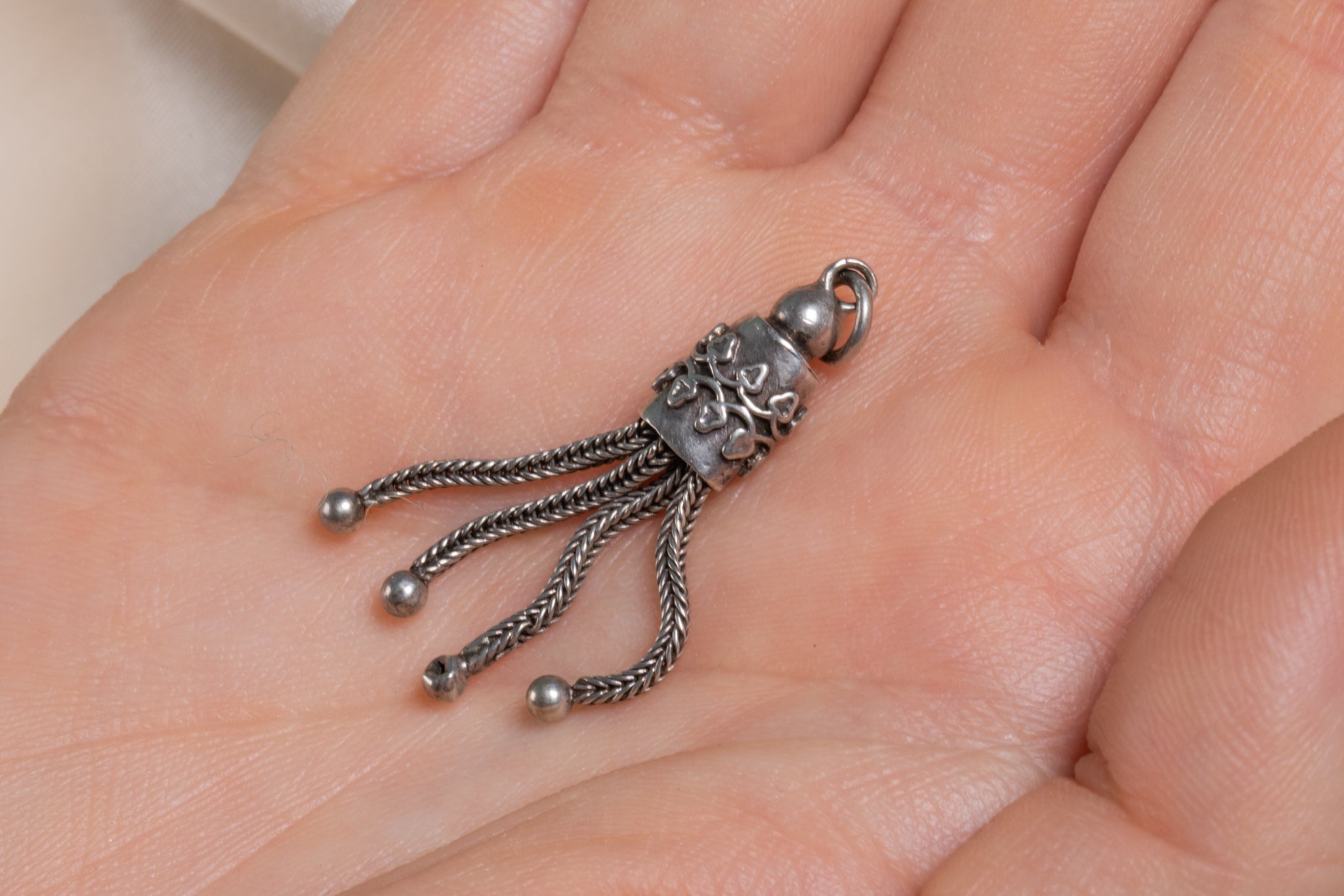VERY GOOD. This Victorian Silver tassel pendant is in very good condition! Each tassel is firmly affixed to her dome and the wire has remained tightly woven. There is a ding to one of the balls at the end but due to her continual movement, it is barely noticeable! The ornate detailing is securely soldered onto her dome and has a moody patina around all of her grooves. Complete with a jump ring you can wear this antique tassel pendant with the utmost confidence!