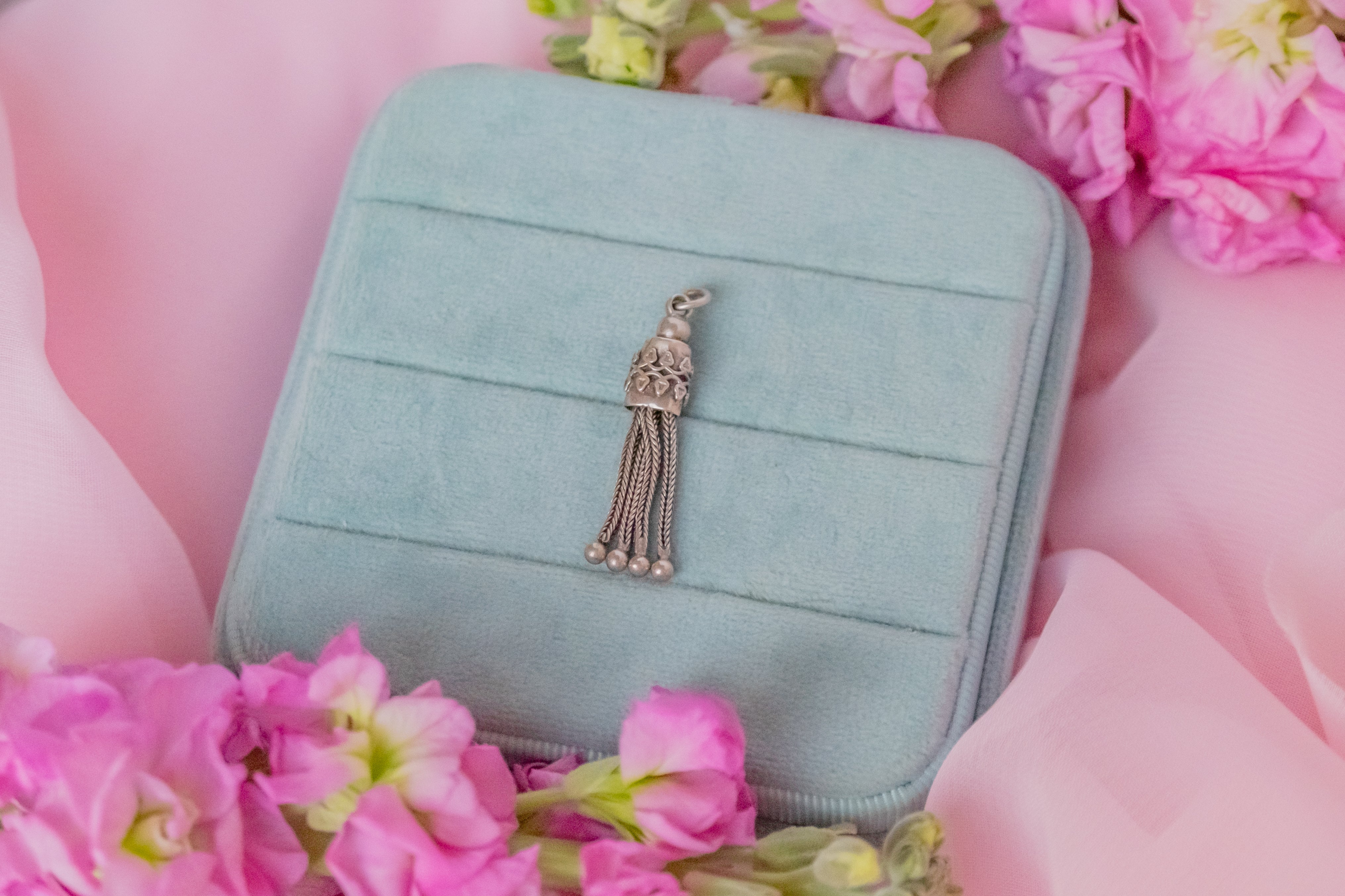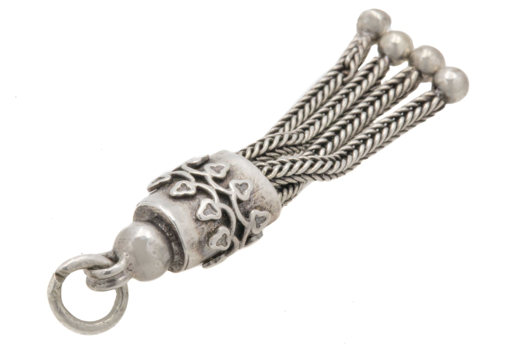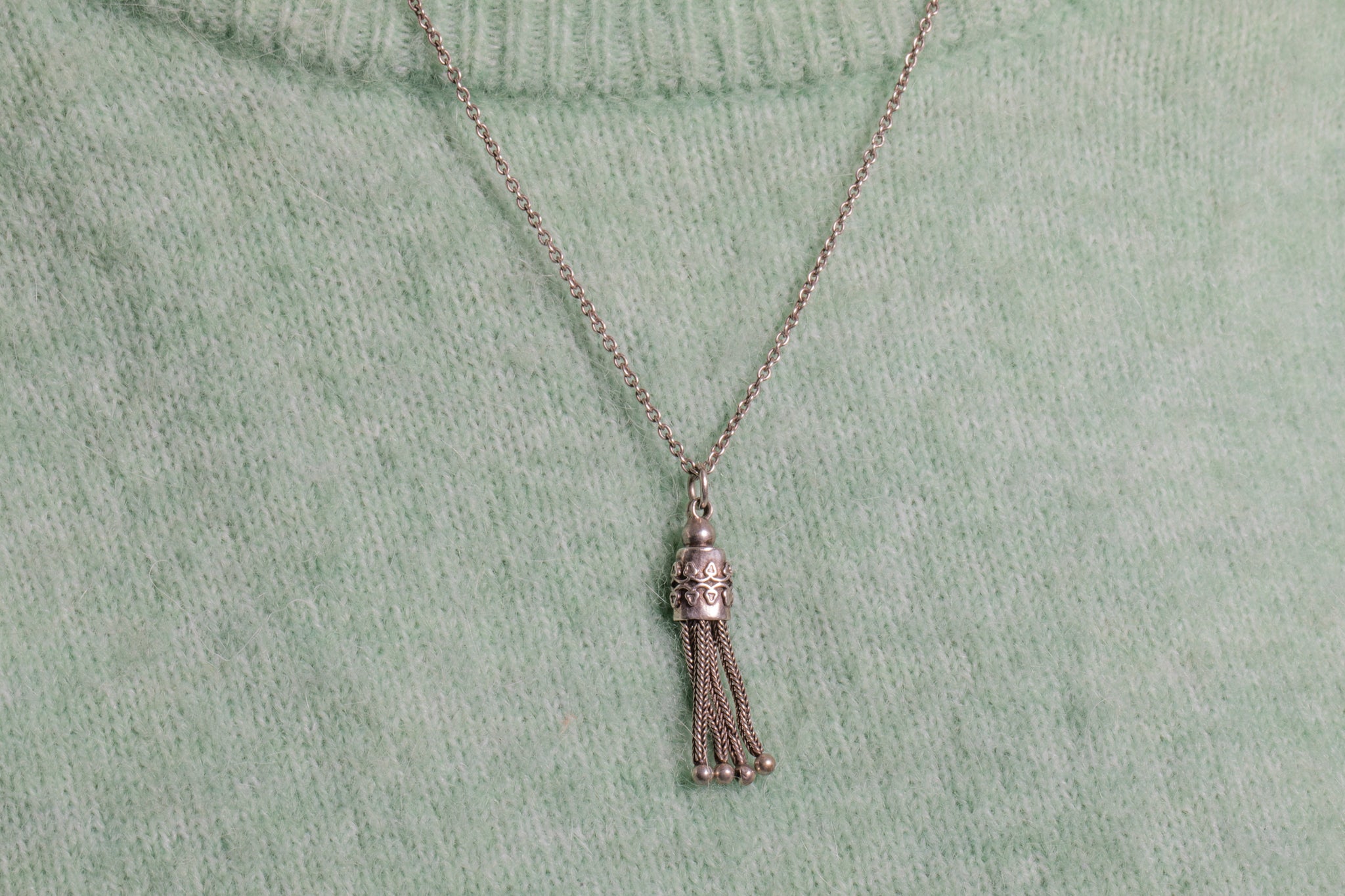VERY GOOD. This Victorian Silver tassel pendant is in very good condition! Each tassel is firmly affixed to her dome and the wire has remained tightly woven. There is a ding to one of the balls at the end but due to her continual movement, it is barely noticeable! The ornate detailing is securely soldered onto her dome and has a moody patina around all of her grooves. Complete with a jump ring you can wear this antique tassel pendant with the utmost confidence!