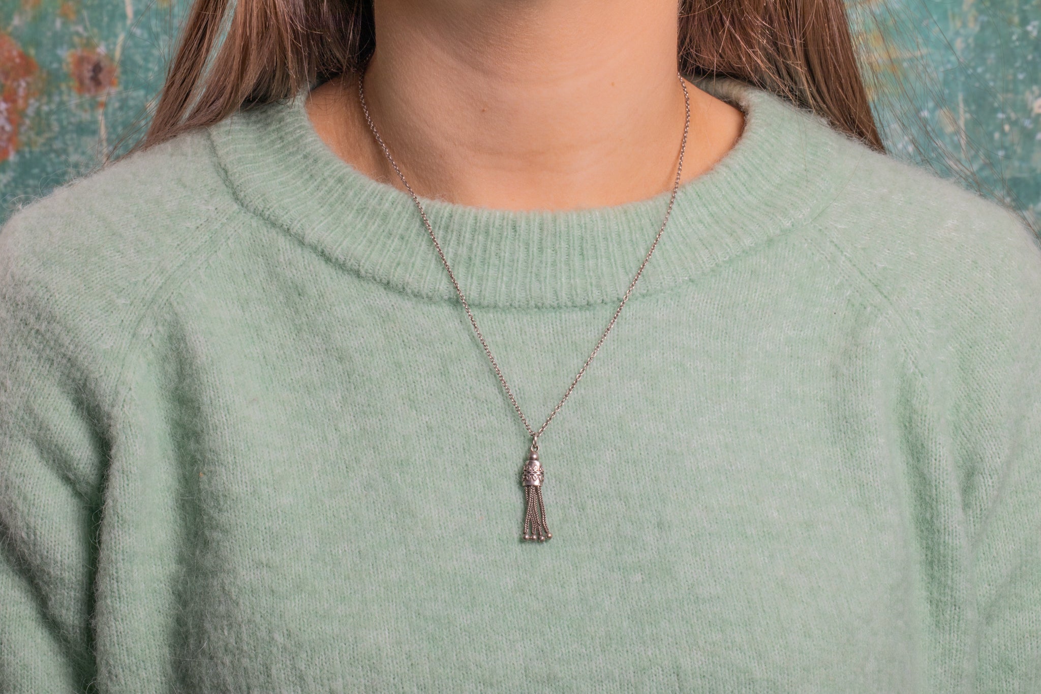 You will never tire of this Victorian Silver tassel pendant's stand-out beauty! Differing from the traditional tassel, she is composed of an oval-shaped dome allowing her to lay flat upon your décolletage. Ornate detailing halo her dome for an extra touch of intrigue.