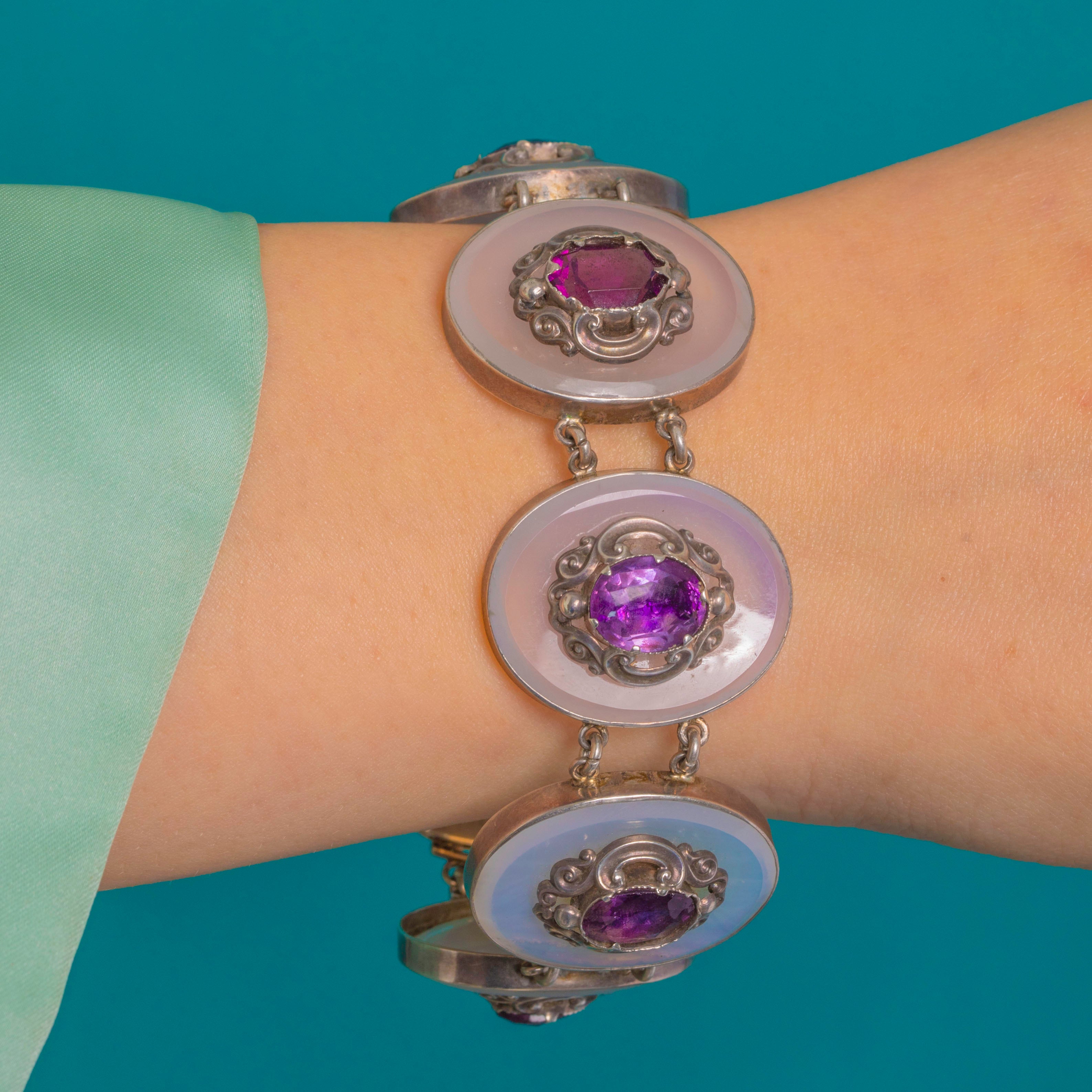 Victorian Silver White Chalcedony Amethyst Disc Bracelet, c.1860