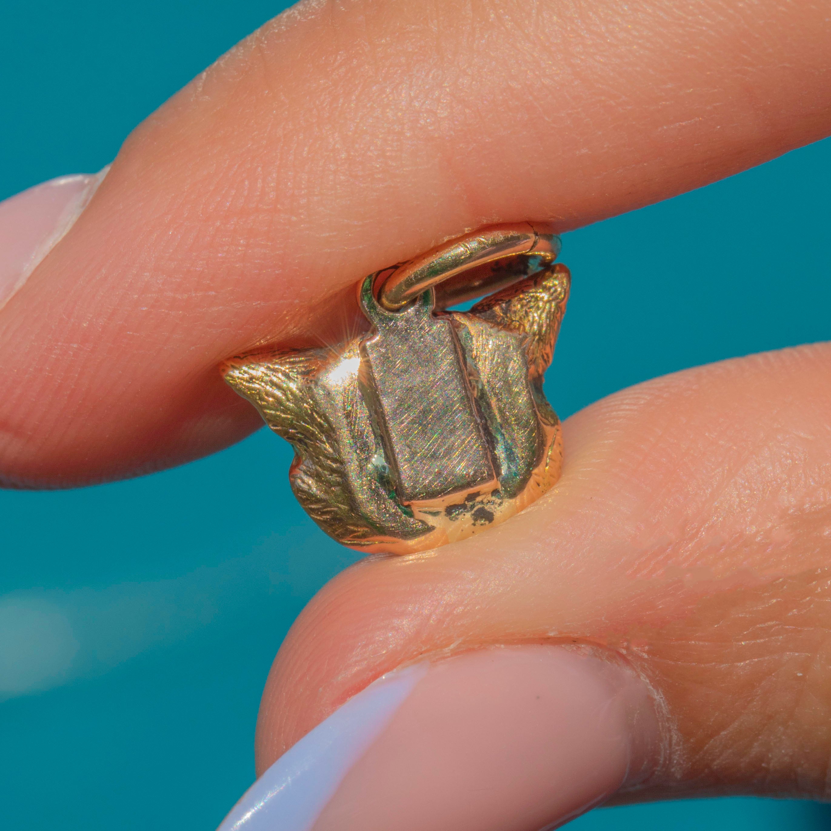 Radiating antique allure, this Victorian charm is exceptionally crafted, adorned with intricate engravings and complete with dazzling Diamond eyes, complemented effortlessly by the warmth of the buttery 18ct Gold.