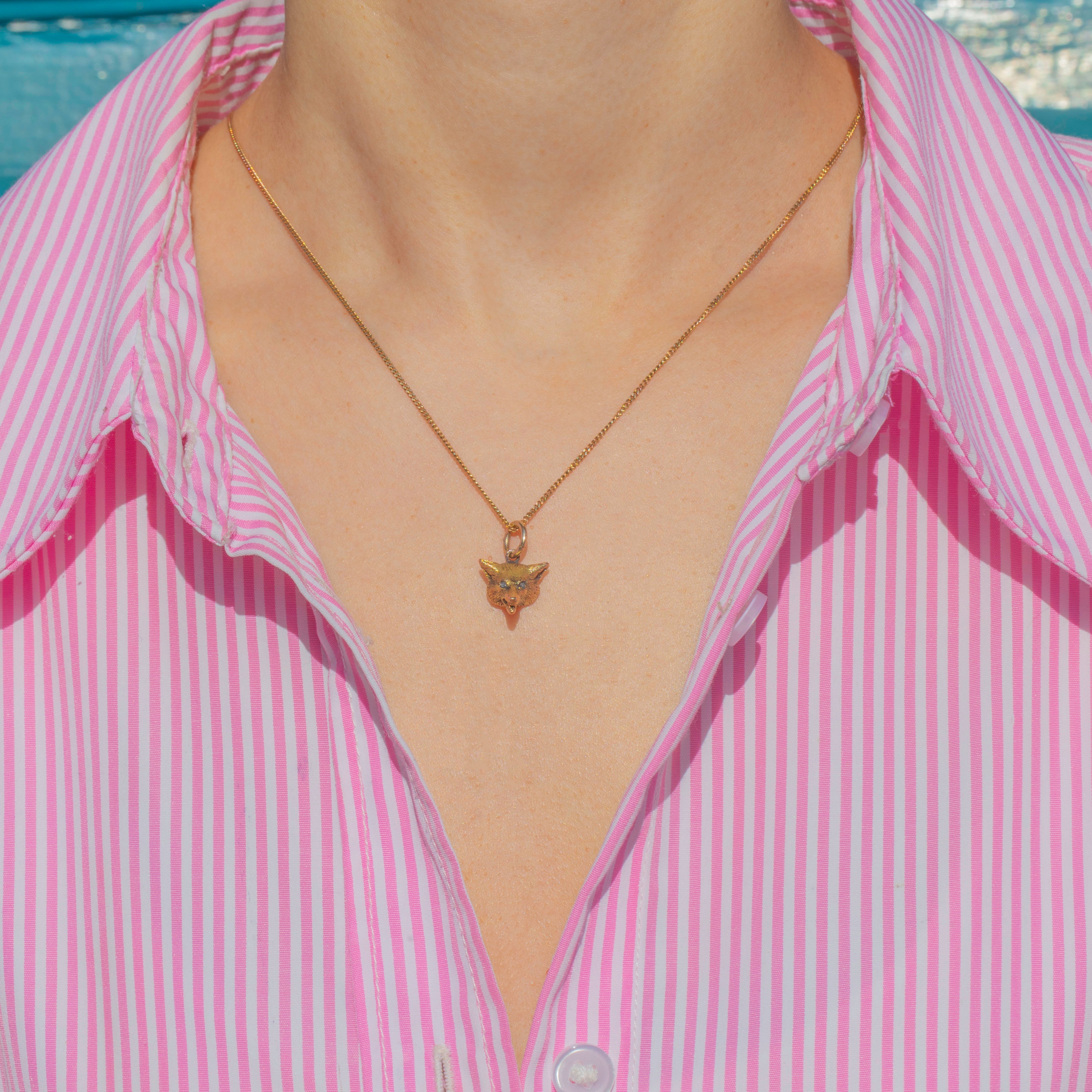 VERY GOOD: This antique solid 18ct Gold and Diamond fox head charm is in very good condition. The Gold is bright and buttery, with only minor signs of wear to the jump ring commensurate with age. There is evidence of a conversion on the back of the pendant, but it is smooth and rests comfortably against the skin. The engraved details add bundles of character and the Diamonds are securely set. With a securely soldered jump ring, this Victorian charm can be worn with utmost confidence.
