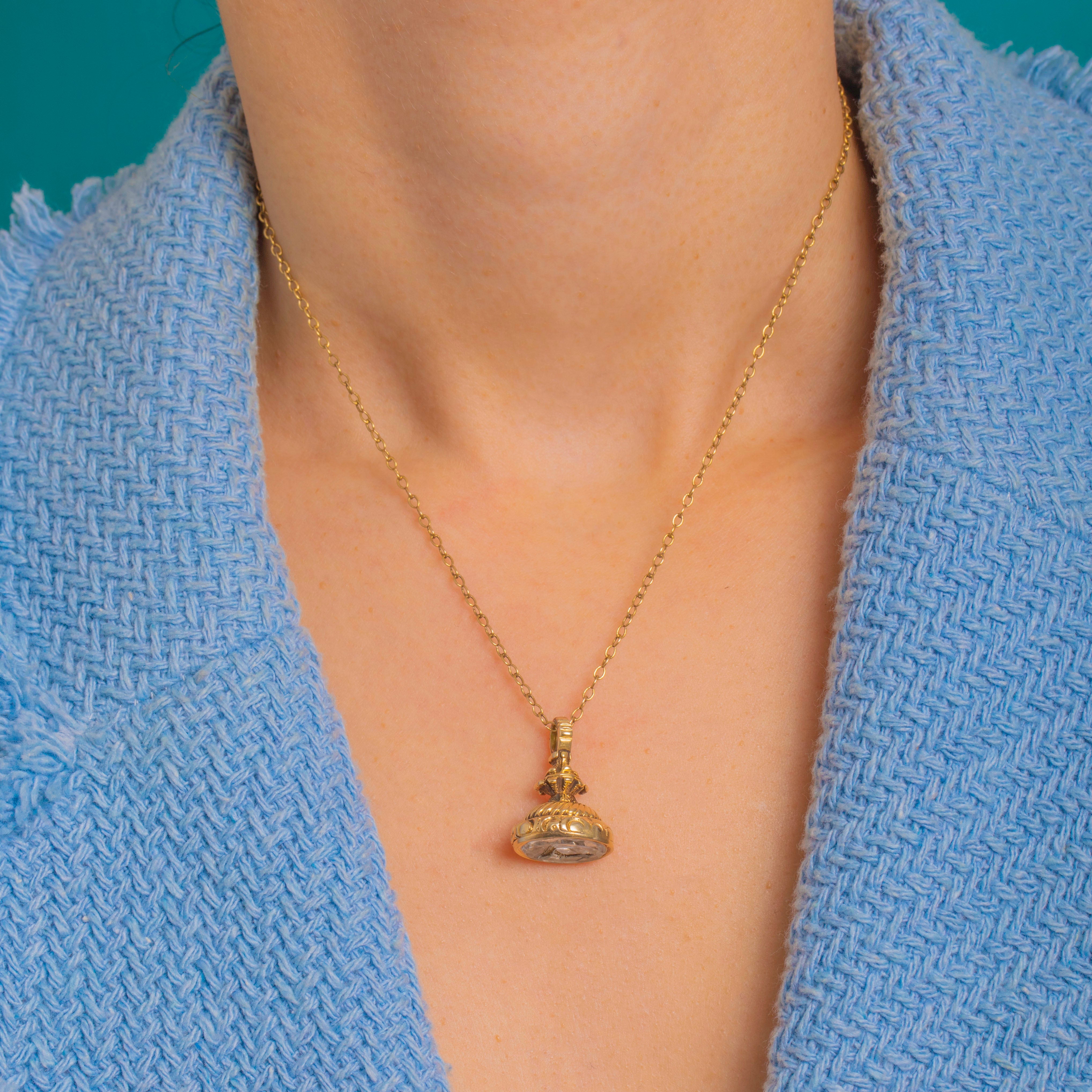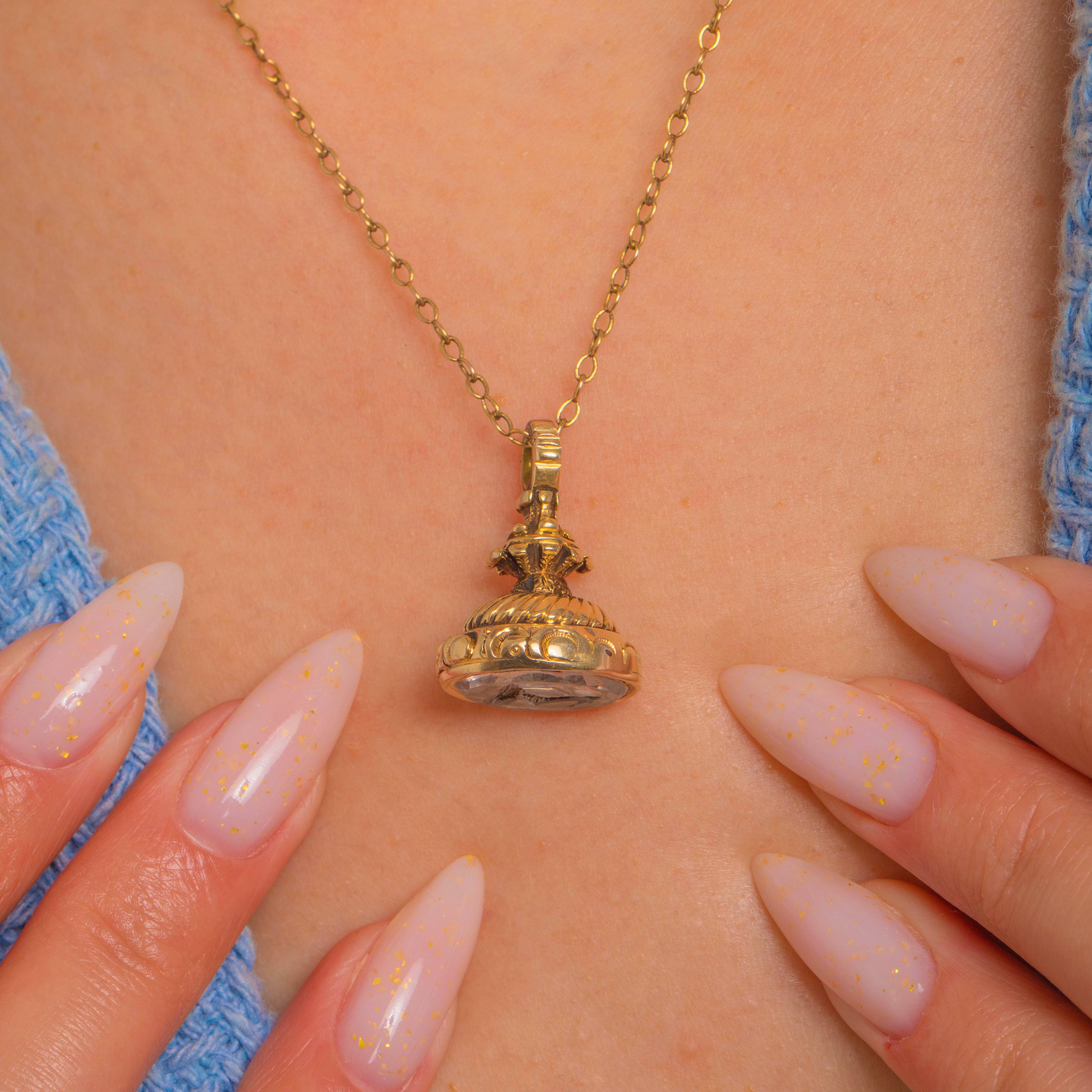 EXCELLENT: The Rock Crystal intaglio is bright with minor edge abrasions and light surface wear commensurate with age. The 9ct Gold mount is secure with a pleasing antique patina and gentle softening to the high points; the fixed bail is sound. No visible repairs or alterations.
