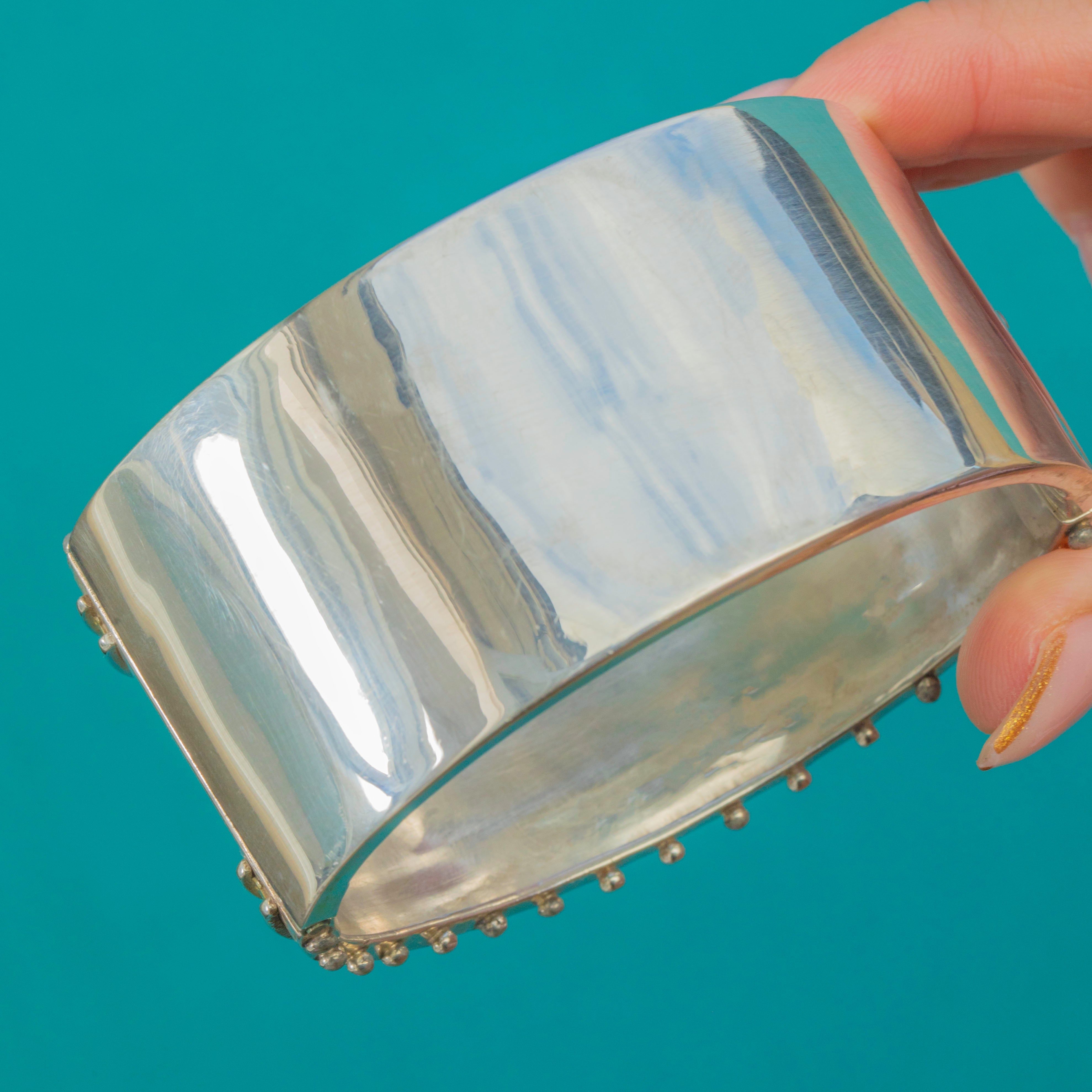 This Victorian Sterling Silver bangle is a wonderfully bold example of Aesthetic era design, finished with beautiful applied Gold detailing to the front. The wide profile and solid construction give it a luxurious, substantial feel on the wrist, while the mixed-metal look adds instant depth and interest to any bracelet stack.