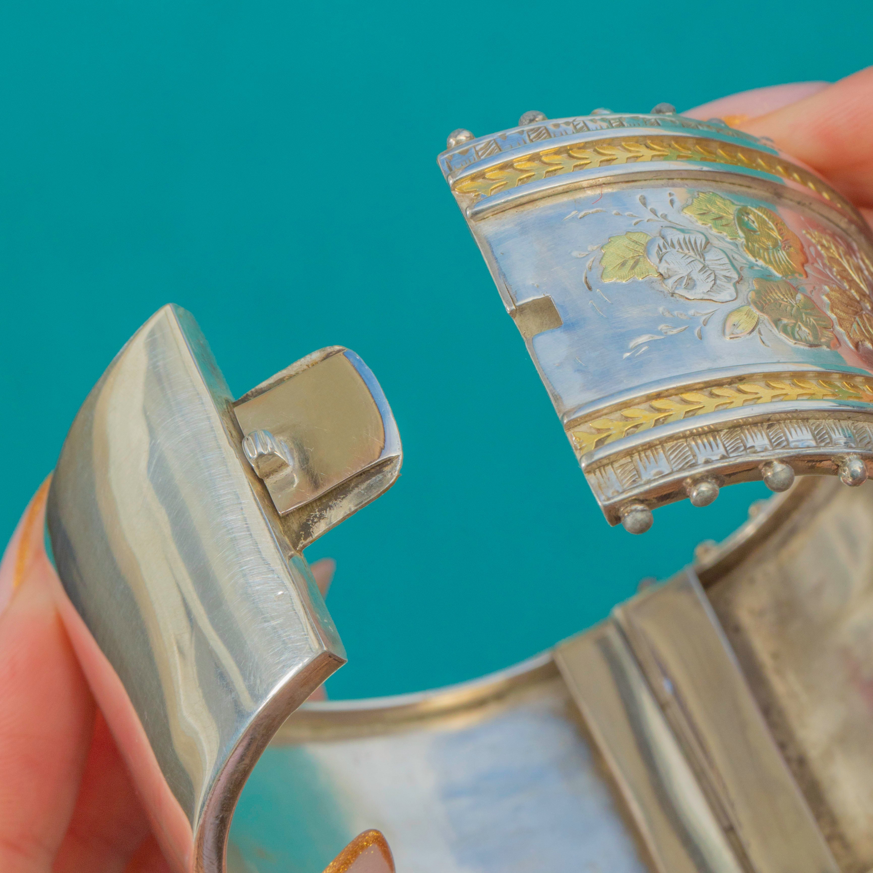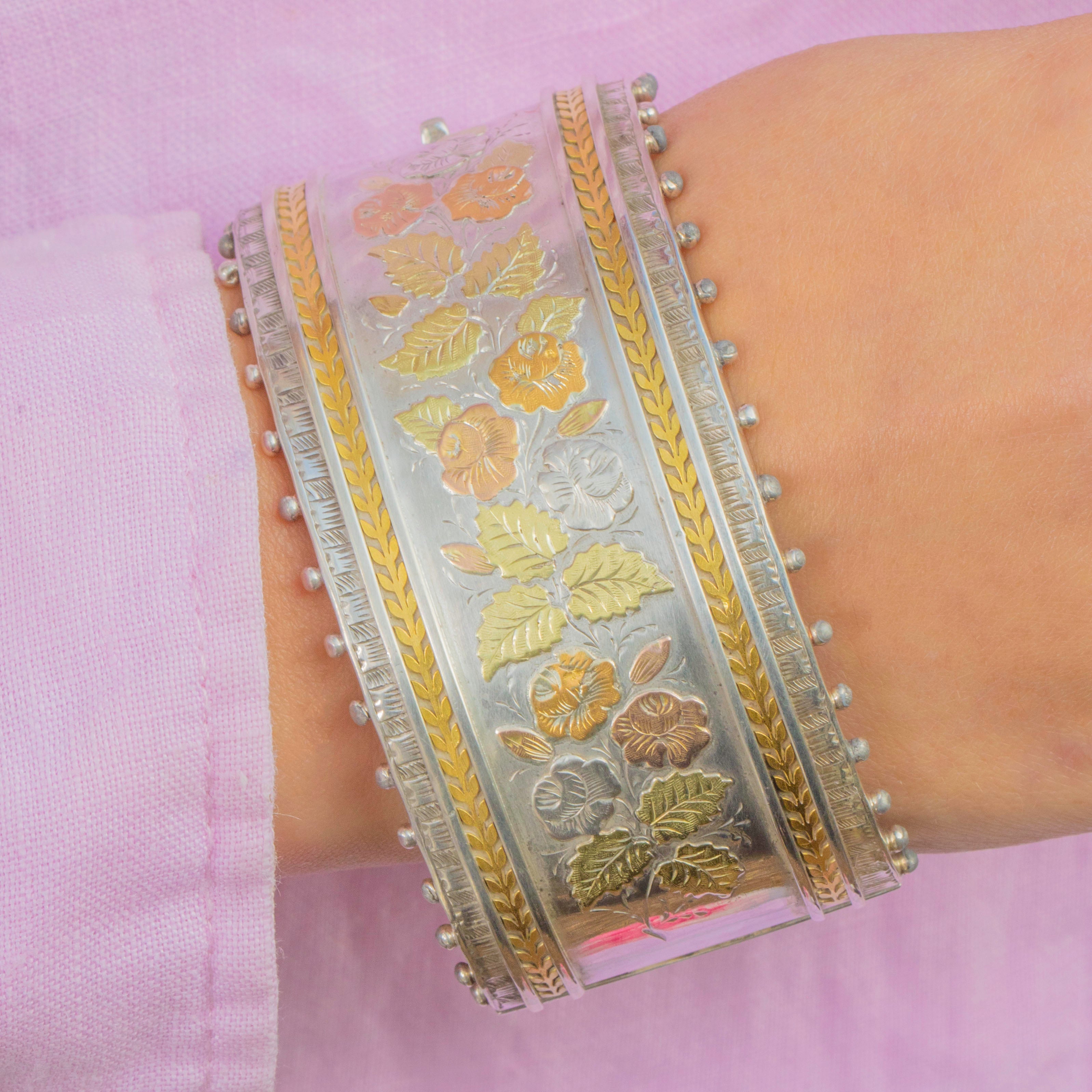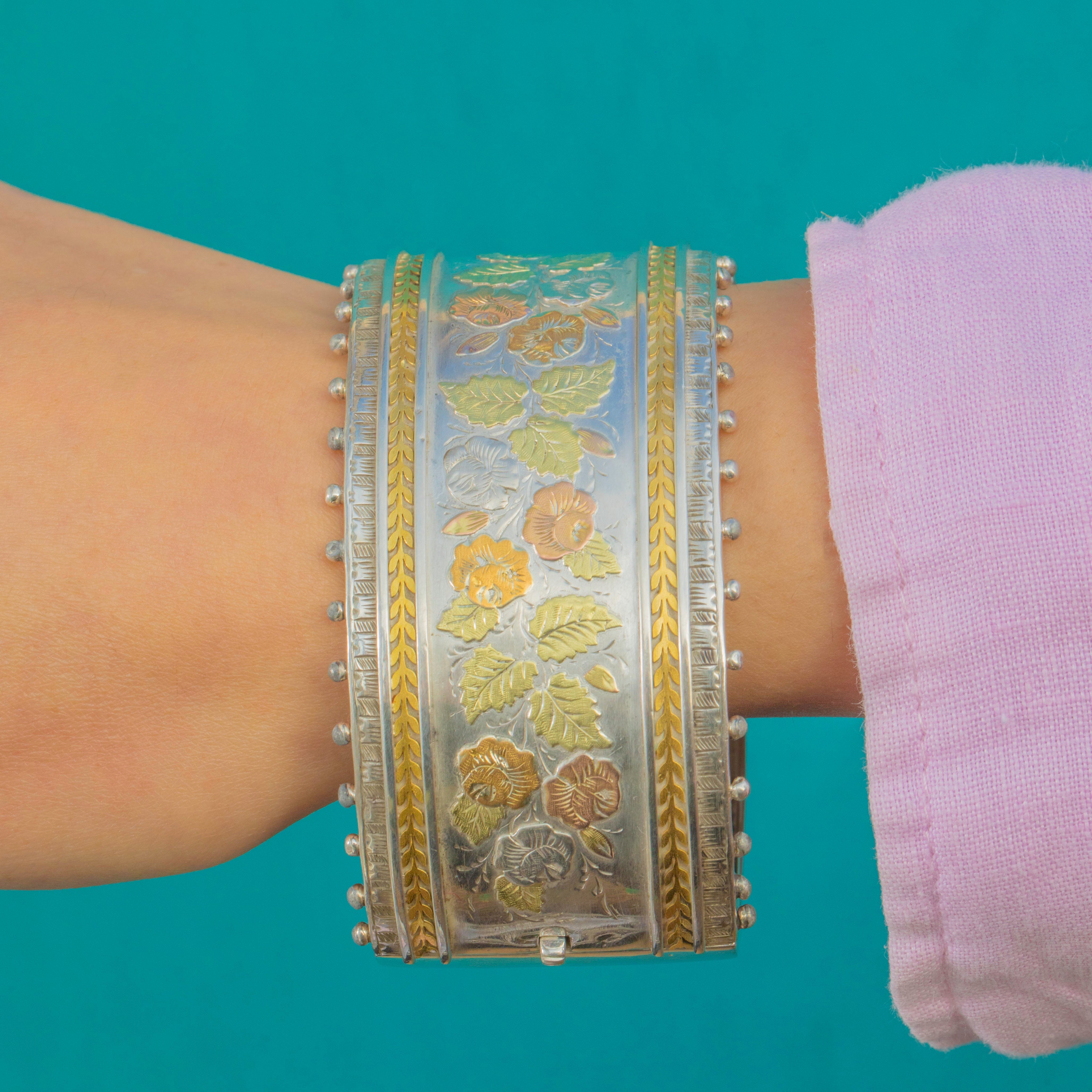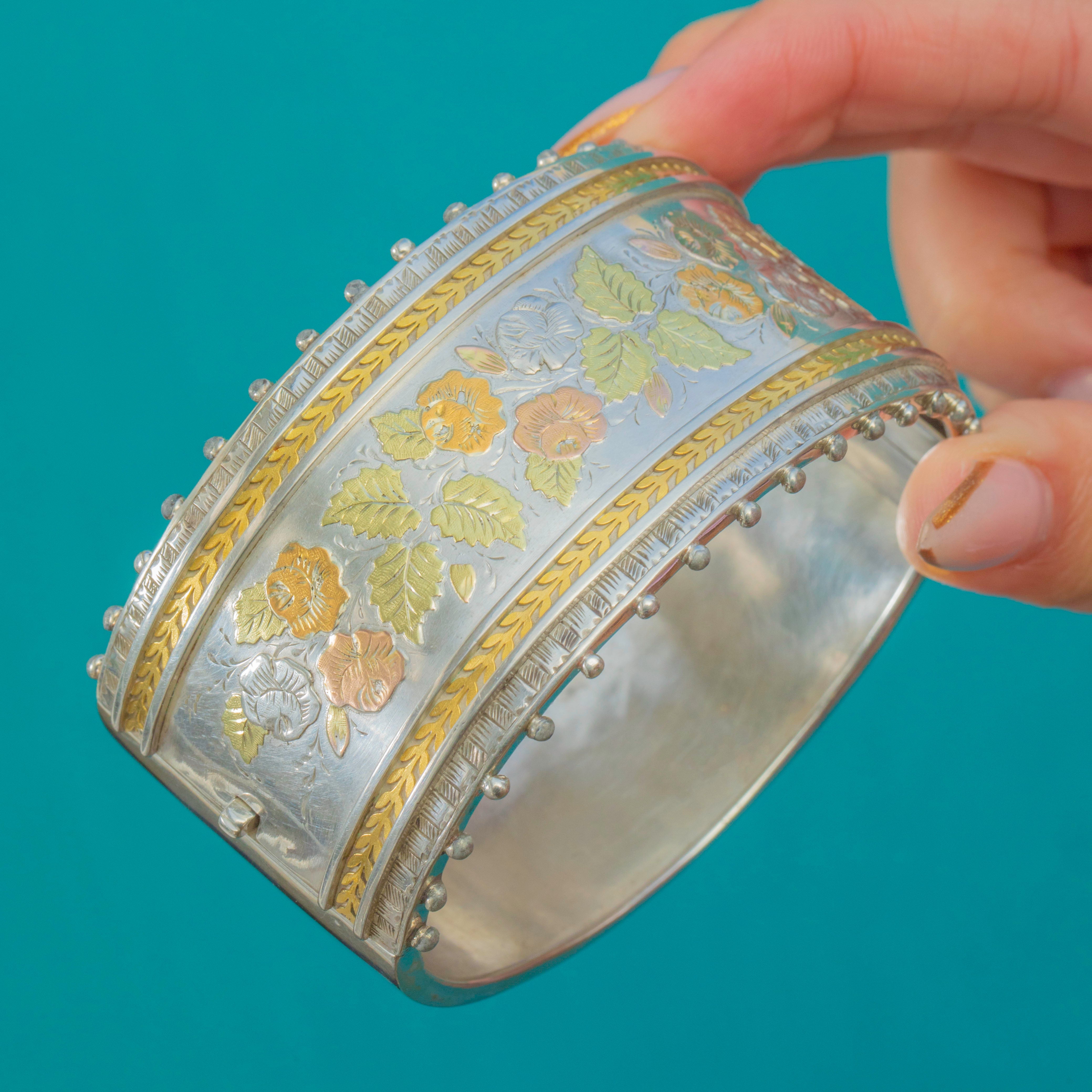 Victorian Sterling Silver Aesthetic Bangle 9ct Gold Flowers & Leaves
