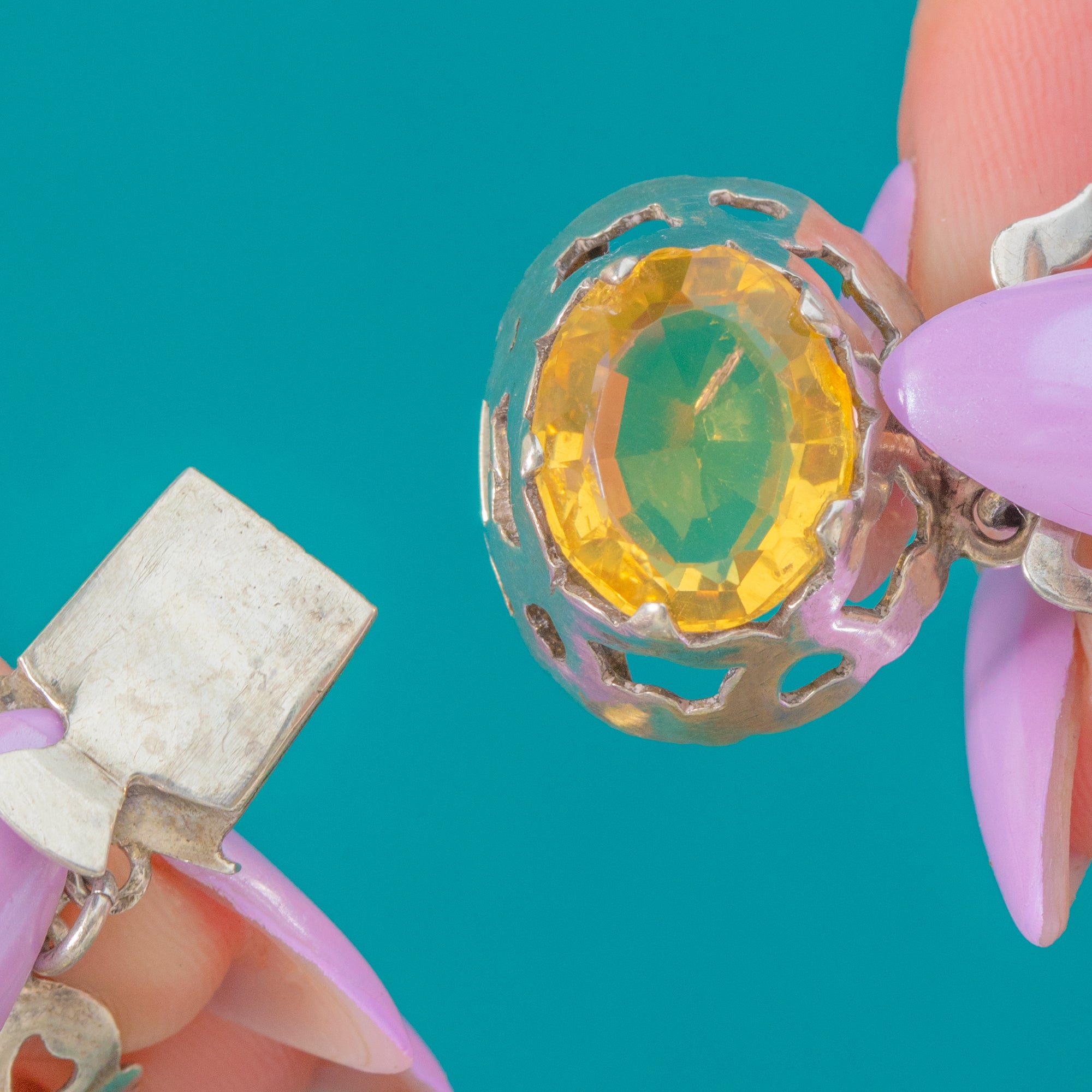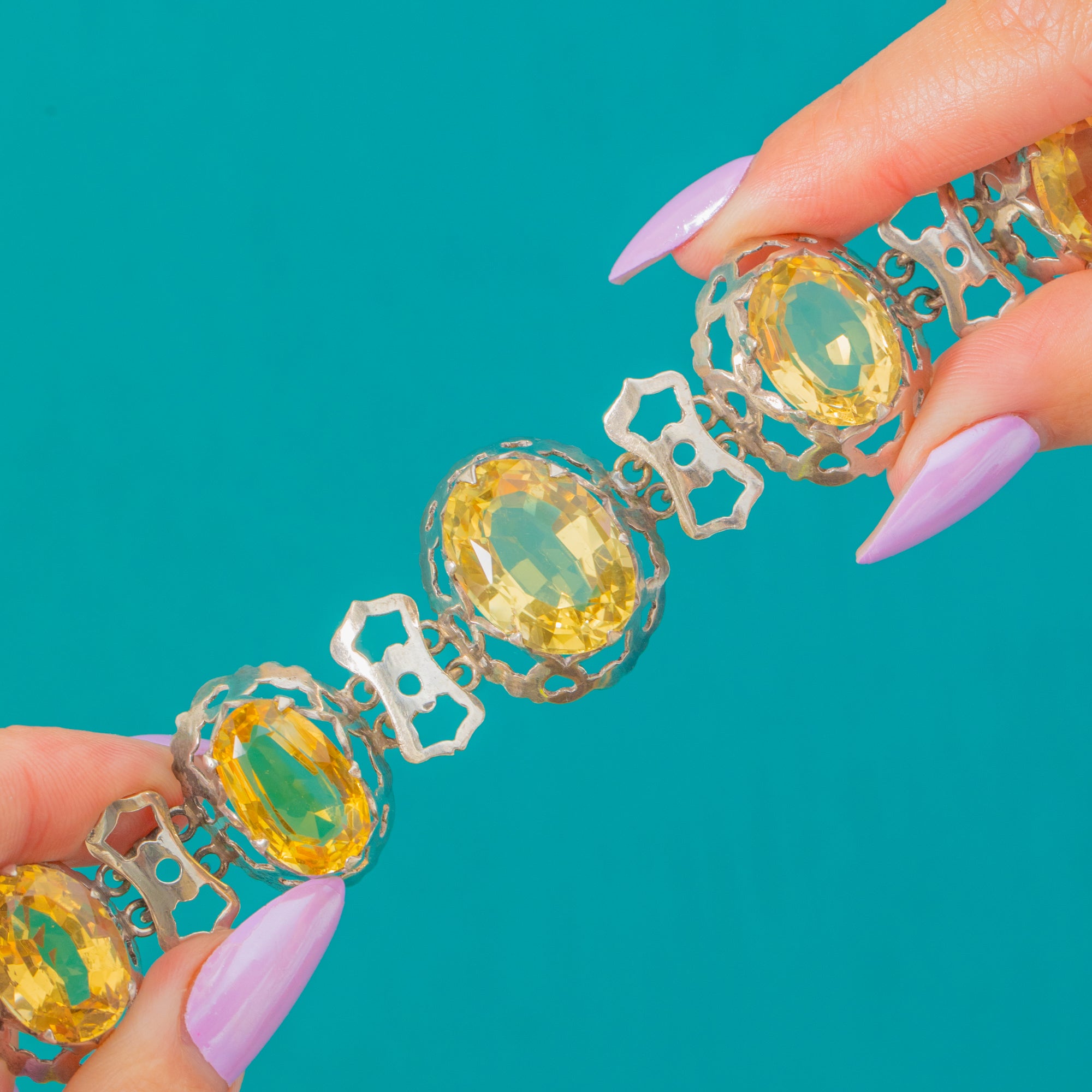 Glowing with sunshine hues, this Victorian Sterling Silver bracelet showcases a captivating line of oval Citrines- approximately 28.00ct in total, each one held in ornate scalloped, openwork bezels. The articulated panel construction drapes beautifully around the wrist, creating a statement silhouette that feels both elegant and opulent.