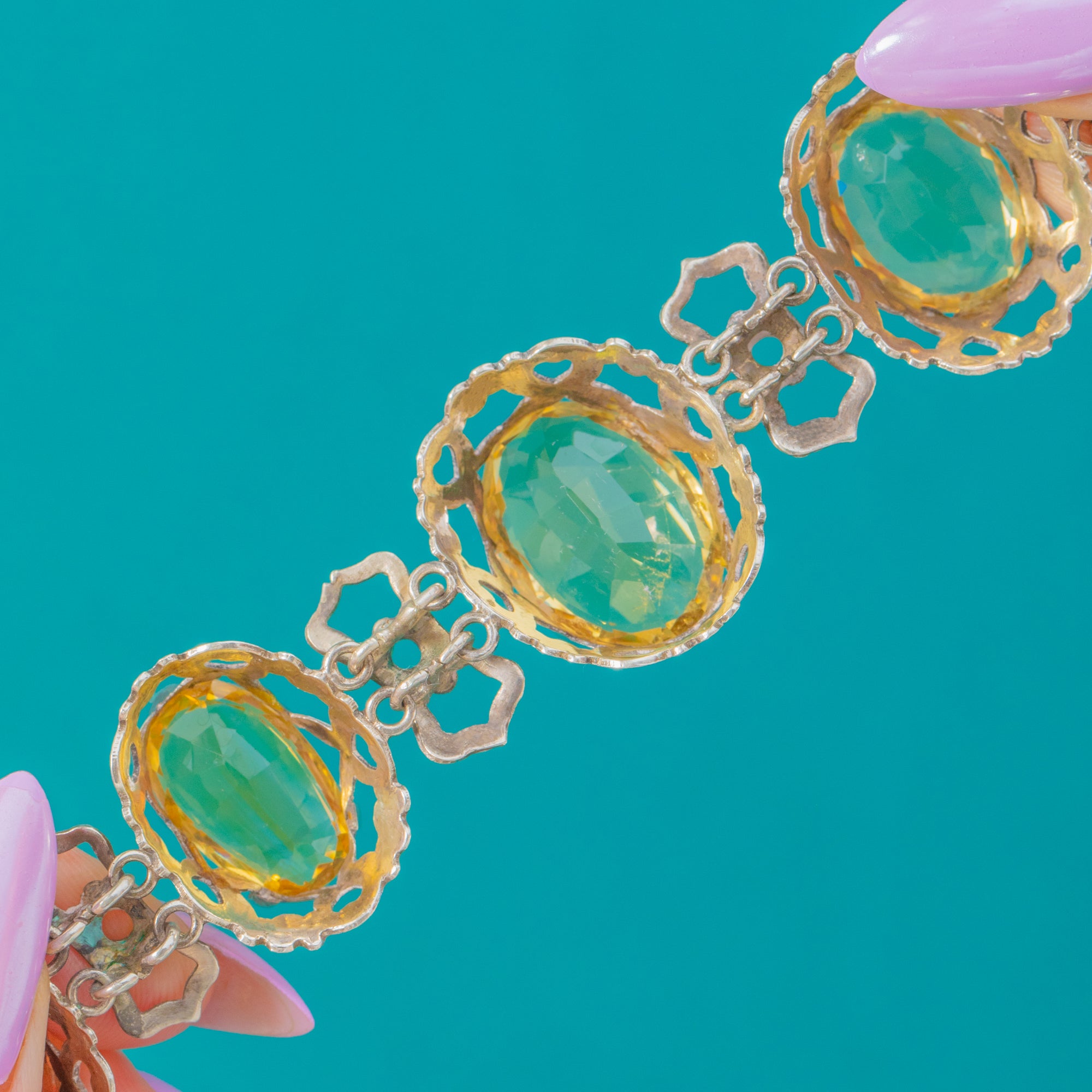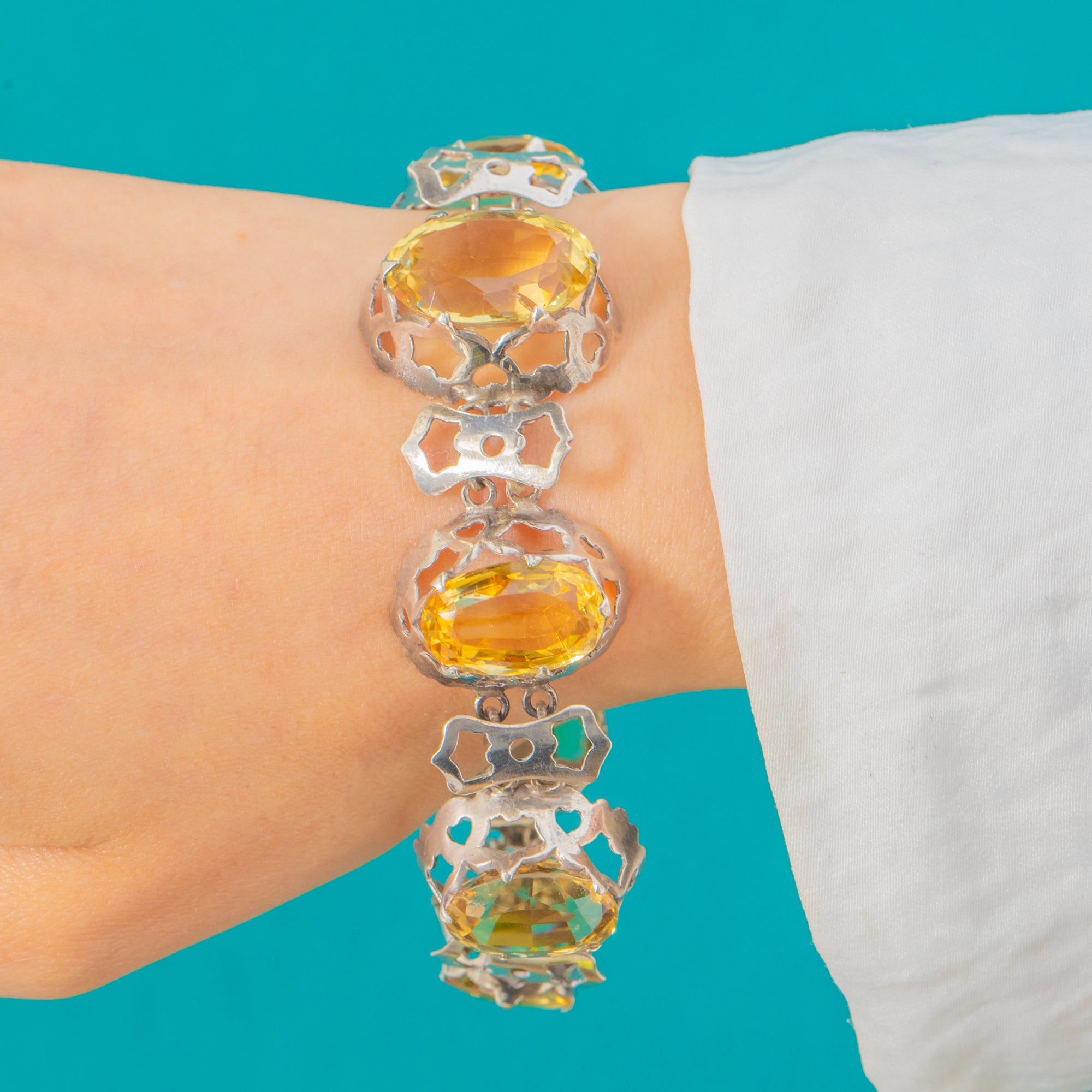 EXCELLENT: Citrines are bright, well-matched and securely set with crisp facets and minimal surface wear. The Sterling Silver settings and links are strong and articulate smoothly. No obvious signs of later repairs or restorations.The clasp is secure.