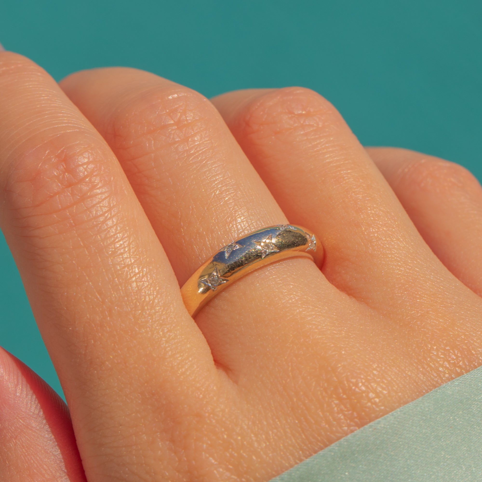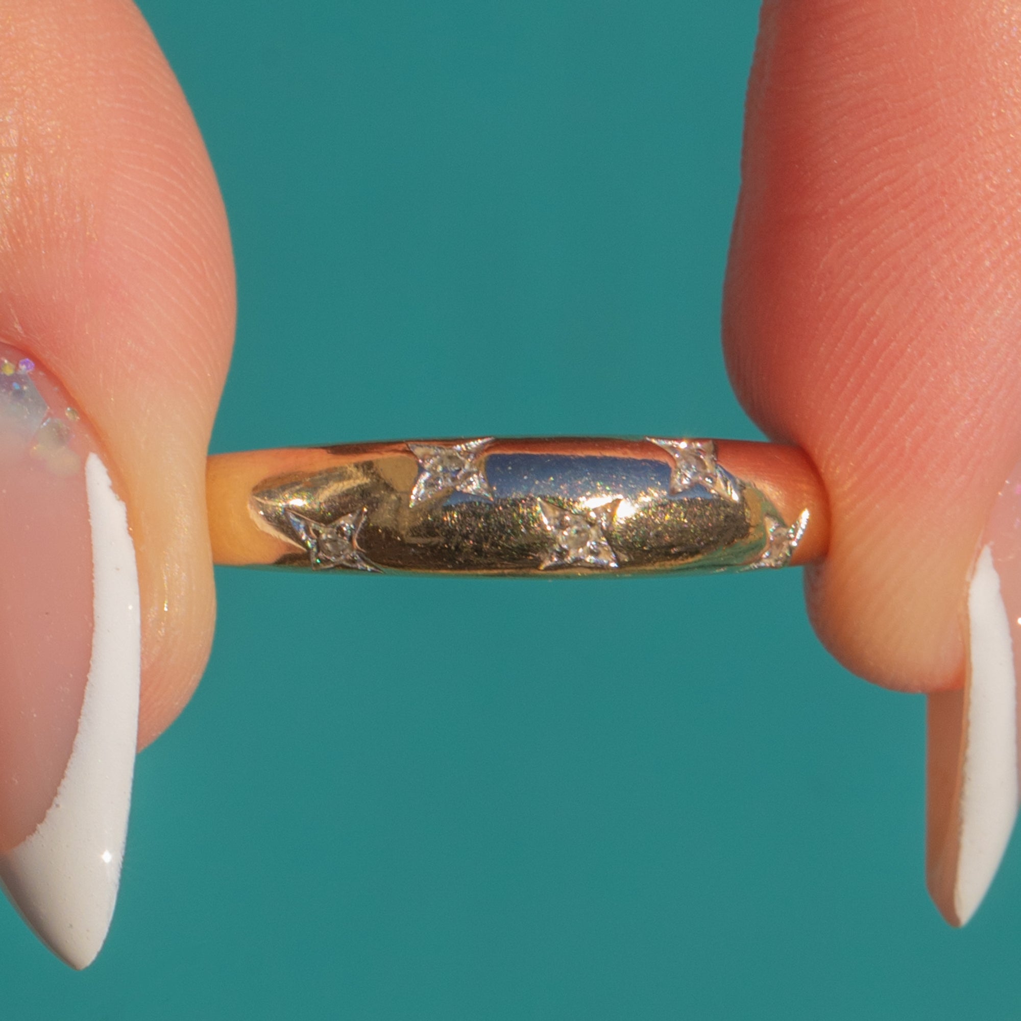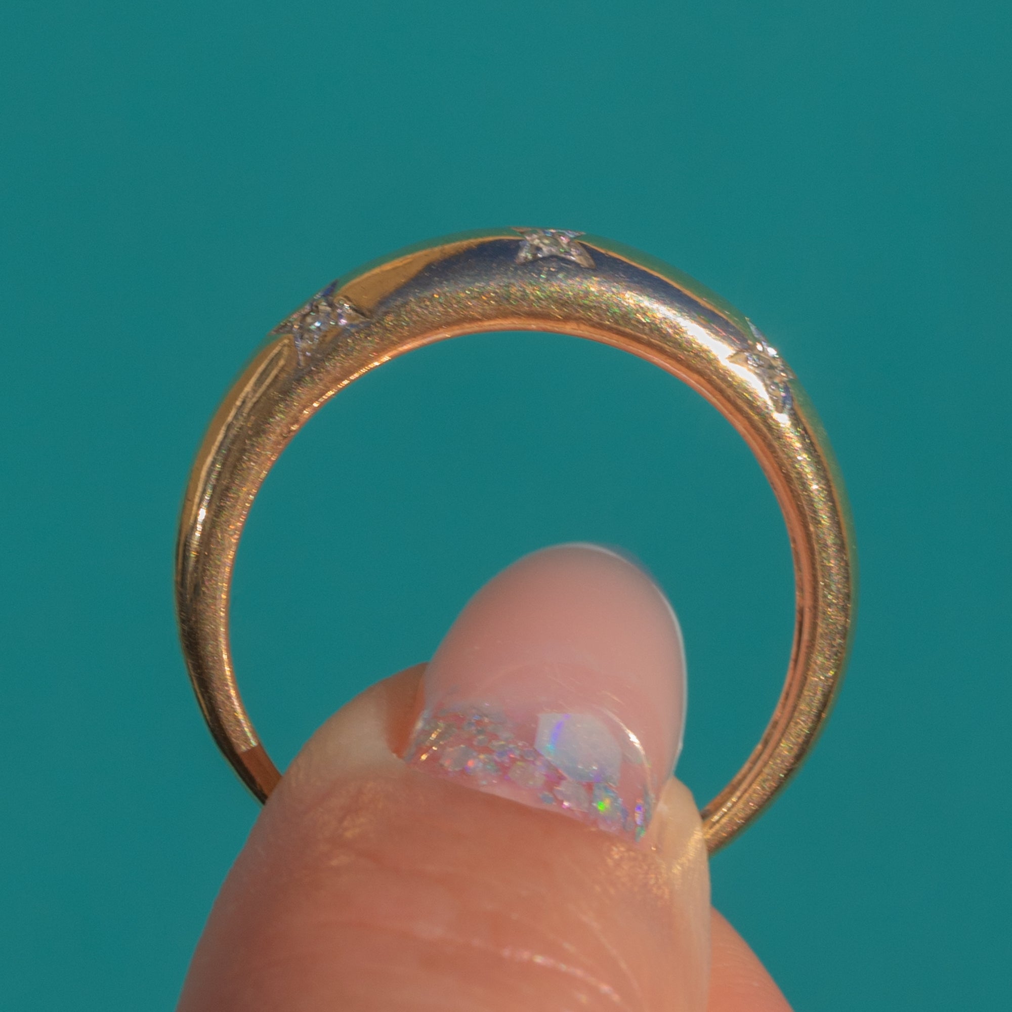 A charming vintage band ring set with tiny twinkling Diamonds in engraved star settings, the surface catching the light with a soft celestial sparkle. The warm 9ct Gold contrasts beautifully against the cool white star motifs, creating a subtle shimmer that feels romantic, playful, and perfect for everyday wear.