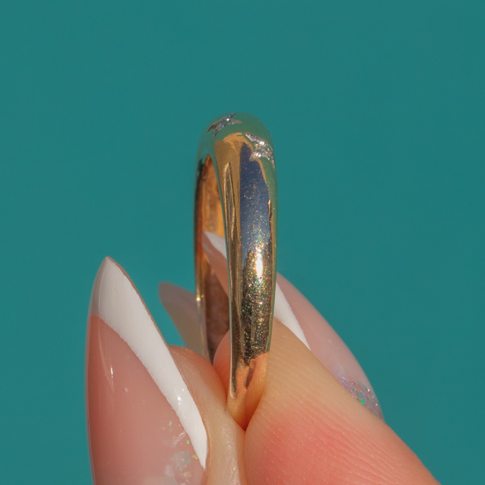 Slim, comfortable and easy to stack, it pairs beautifully with solitaires or sits elegantly on its own. A sweet and wearable piece with a little starlit magic.