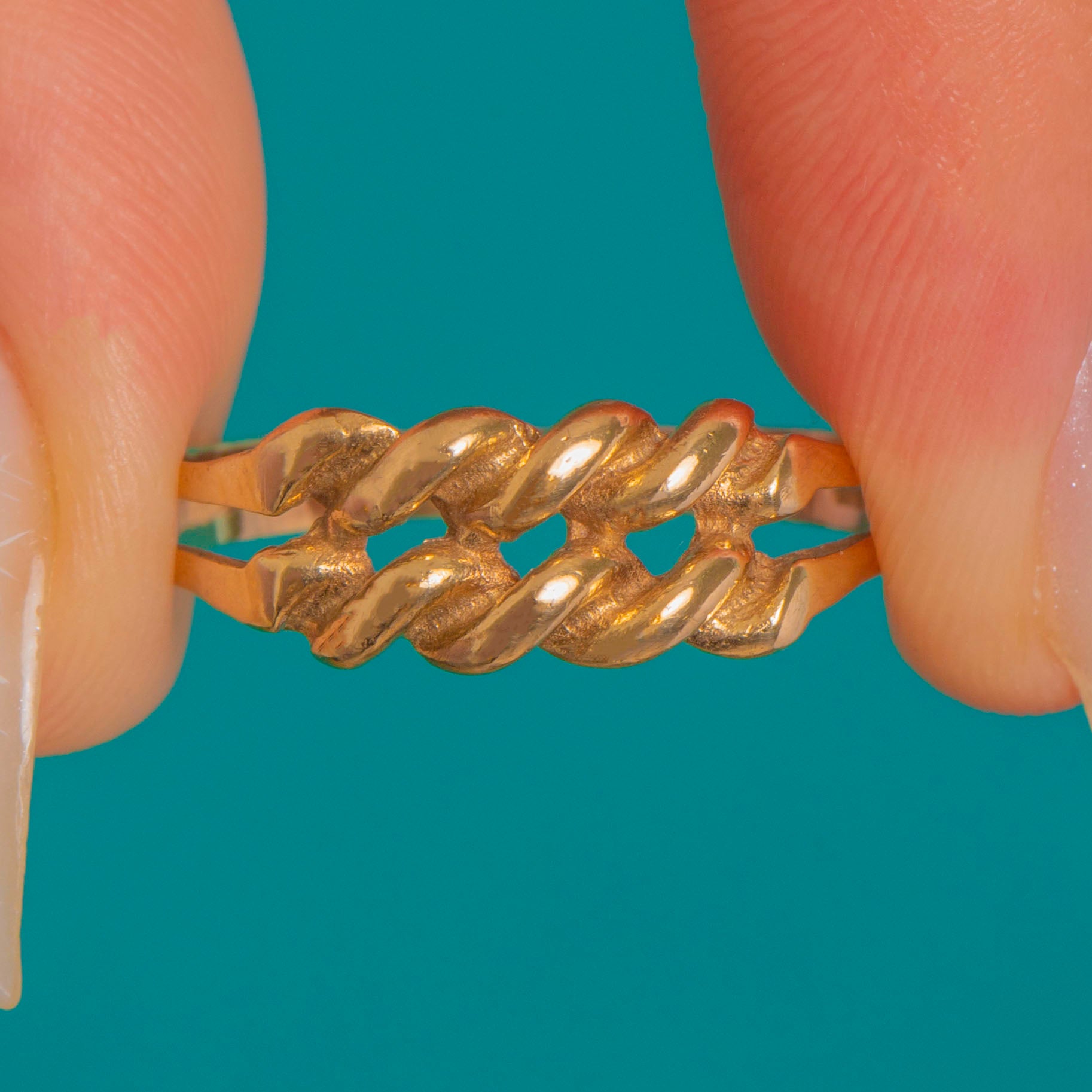 This Vintage 9ct Gold double row Keeper ring is all clean lines and tactile texture. The head is formed by two interlacing rows of domed curb links with elegant split shoulders tapering to a polished shank, creating a sleek, low-profile silhouette that stacks beautifully and wears effortlessly every day.