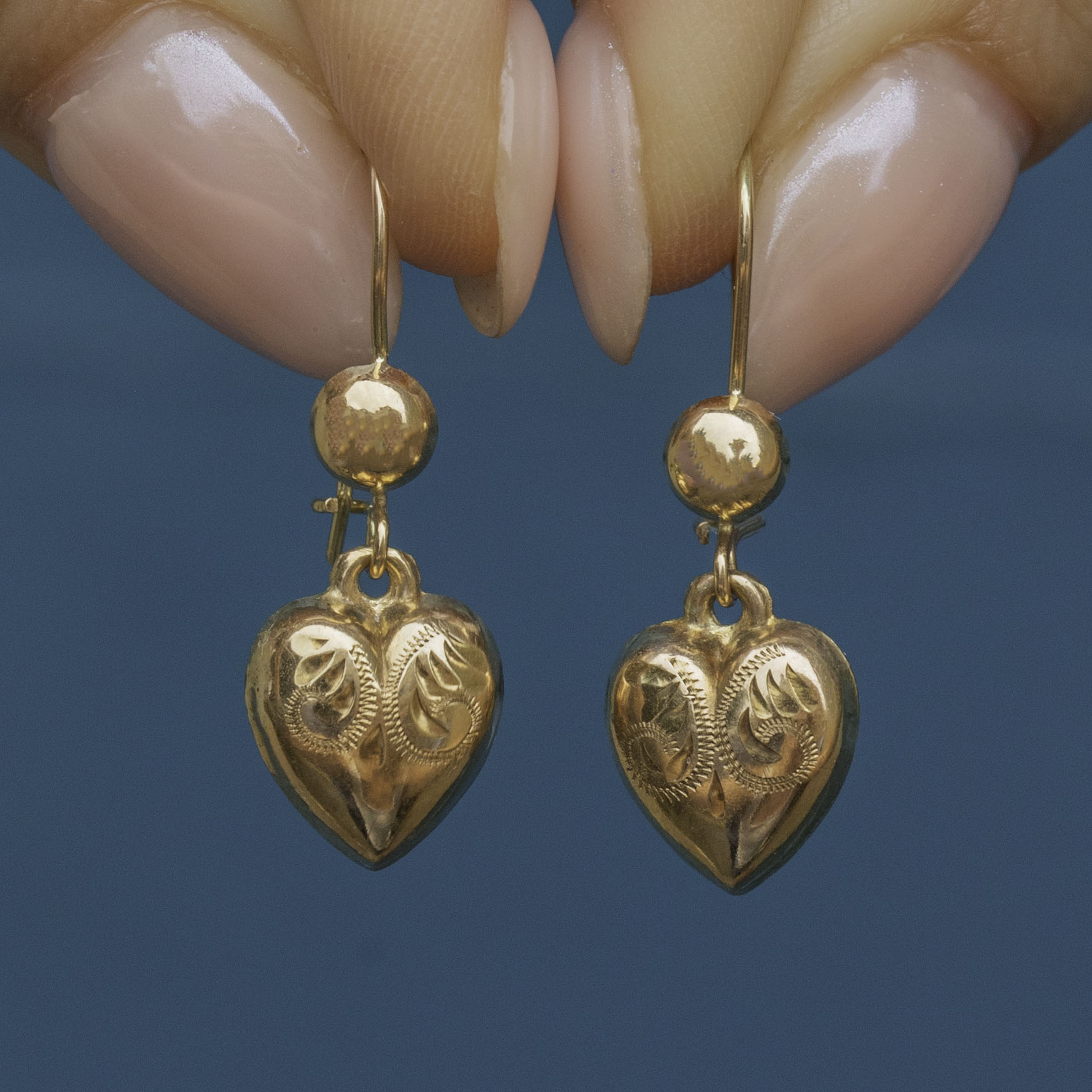 EXCELLENT. These Vintage 9ct Gold puffy heart drop earrings are in excellent condition. The 9ct Gold is warm and radiant, with crisp and clear engravings. Hallmarks are present on the back, dating these Vintage heart earrings to 1965. Totally irresistible, we have fallen in love with these Vintage heart earrings!
