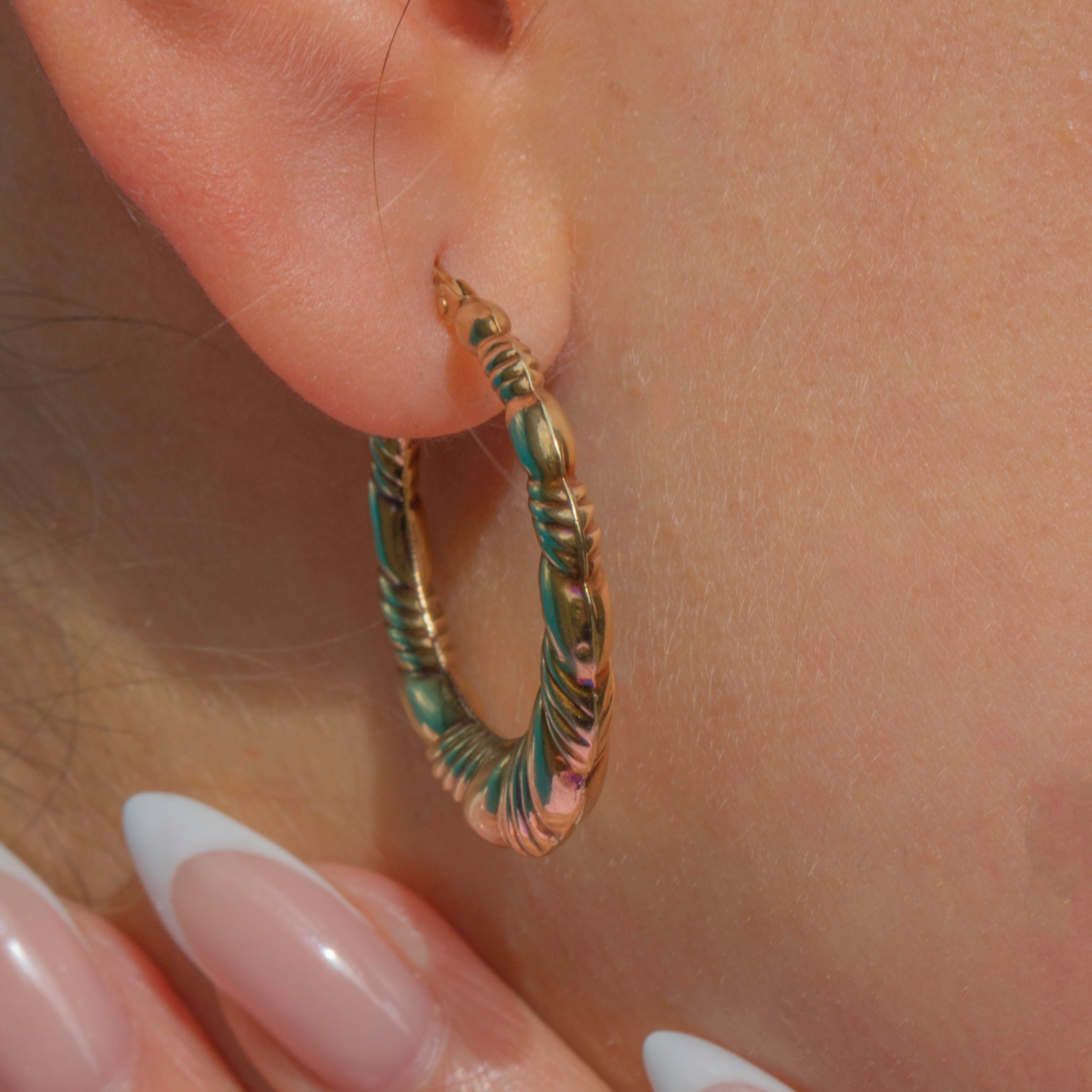 A fabulous pair of large vintage 9ct Gold hoop earrings with a bold twisted design. Their chunky rounded form and polished finish make them a striking yet versatile accessory, perfect for elevating any outfit from day to night.