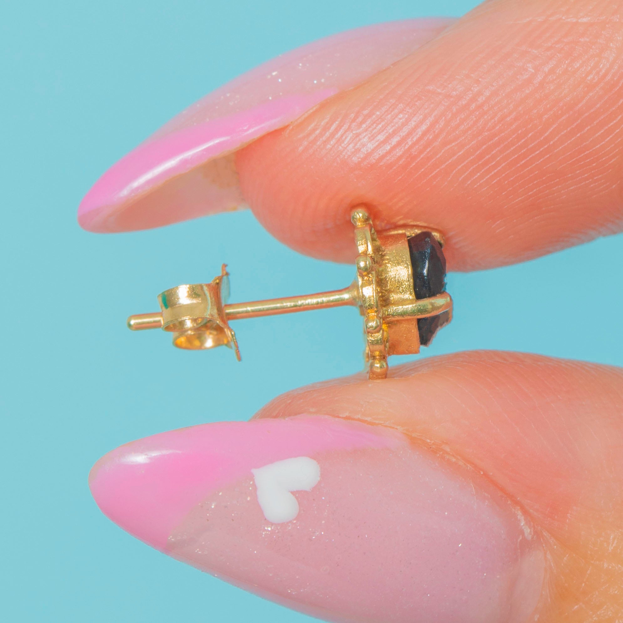 A charming pair of Vintage Sapphire heart stud earrings crafted in 9ct Gold. Each earring features a vivid blue, 0.50ct heart-shaped natural Sapphire securely set in warm yellow Gold.