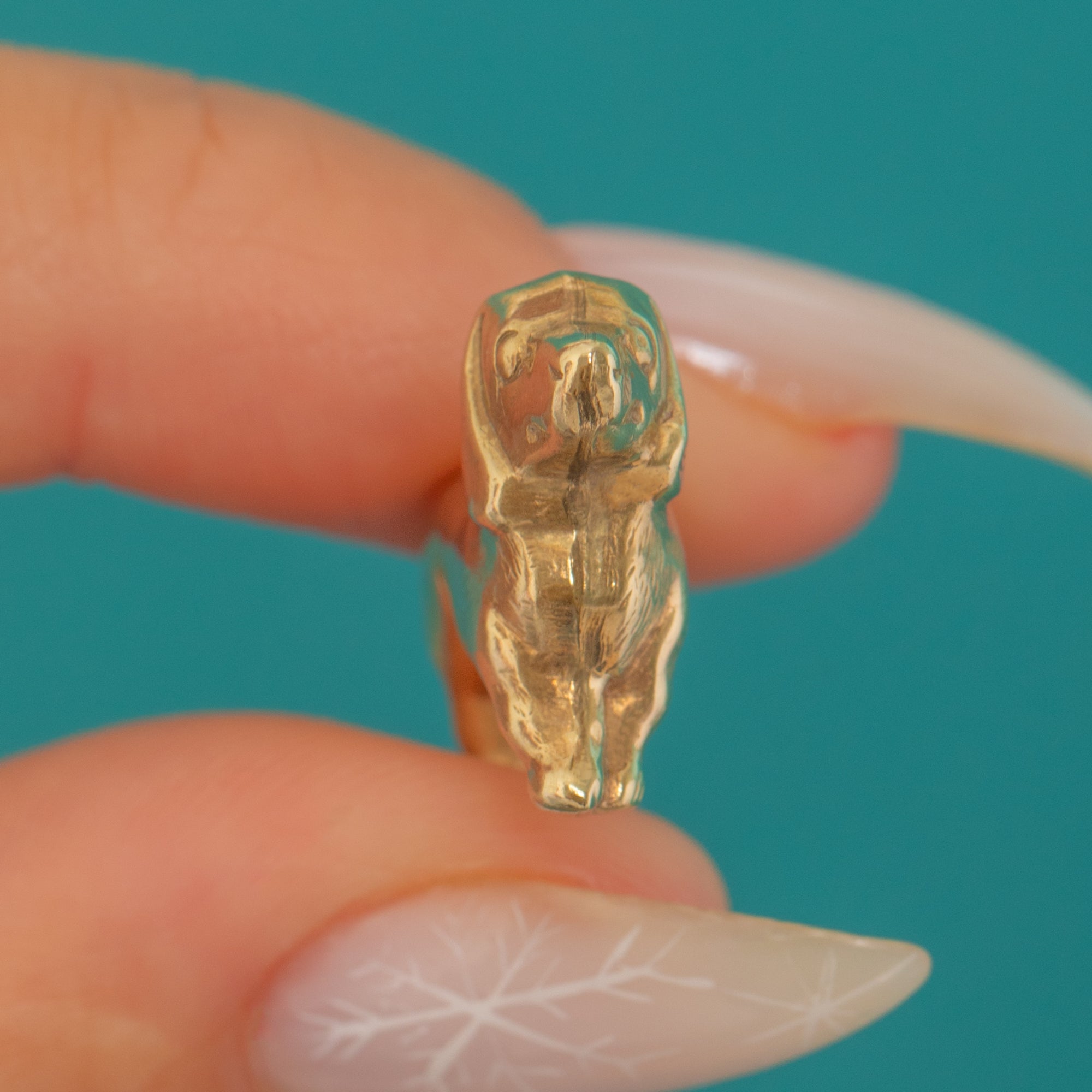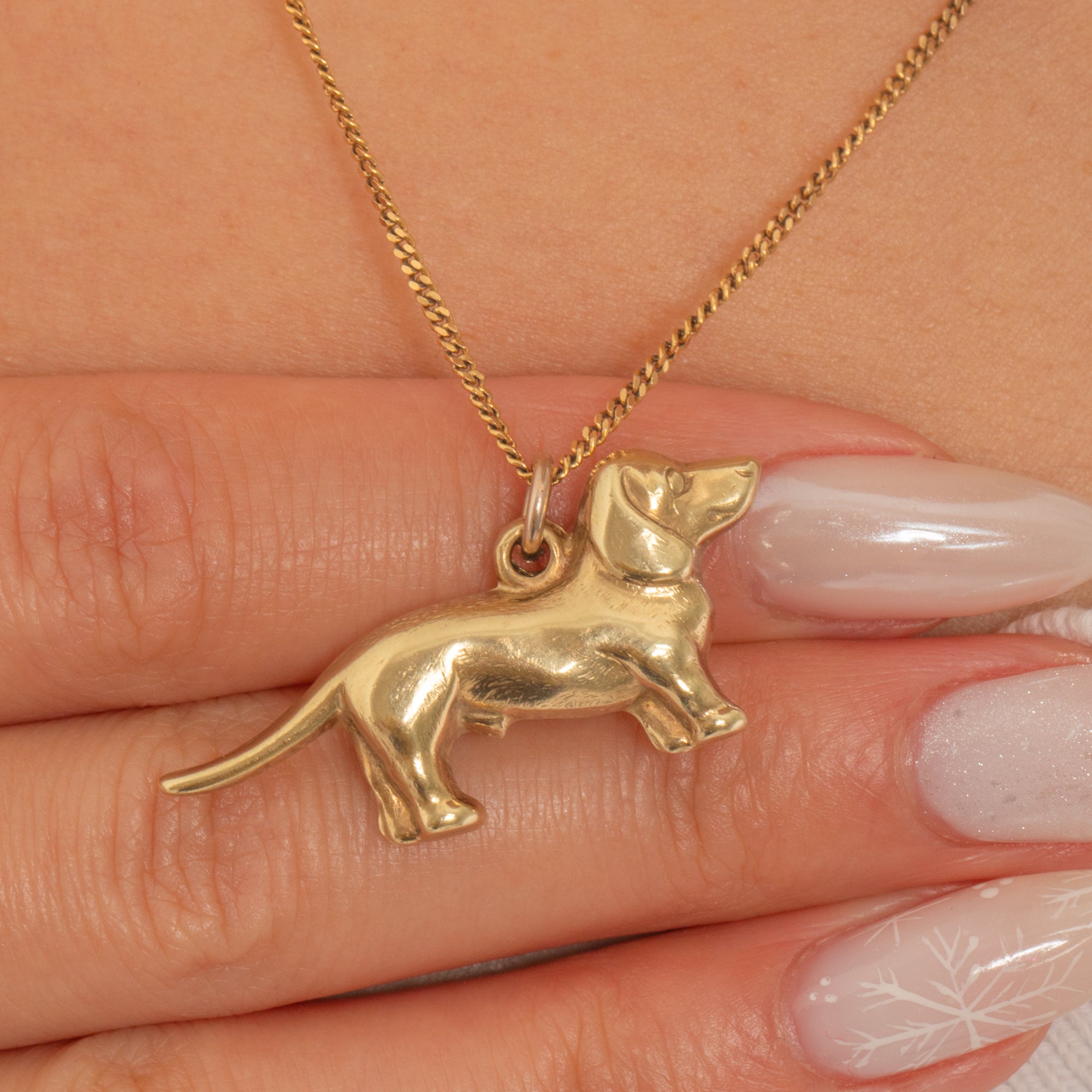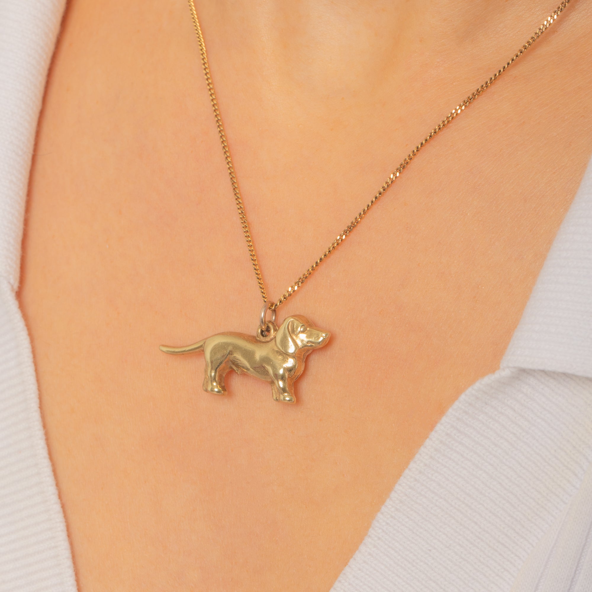 This charming mid-century Dachshund—affectionately known as a sausage dog—is beautifully rendered in 9ct Gold. Its smooth, three-dimensional silhouette captures the breed’s playful character with a refined, minimalist touch, and the high-polish finish glows warmly on the skin.