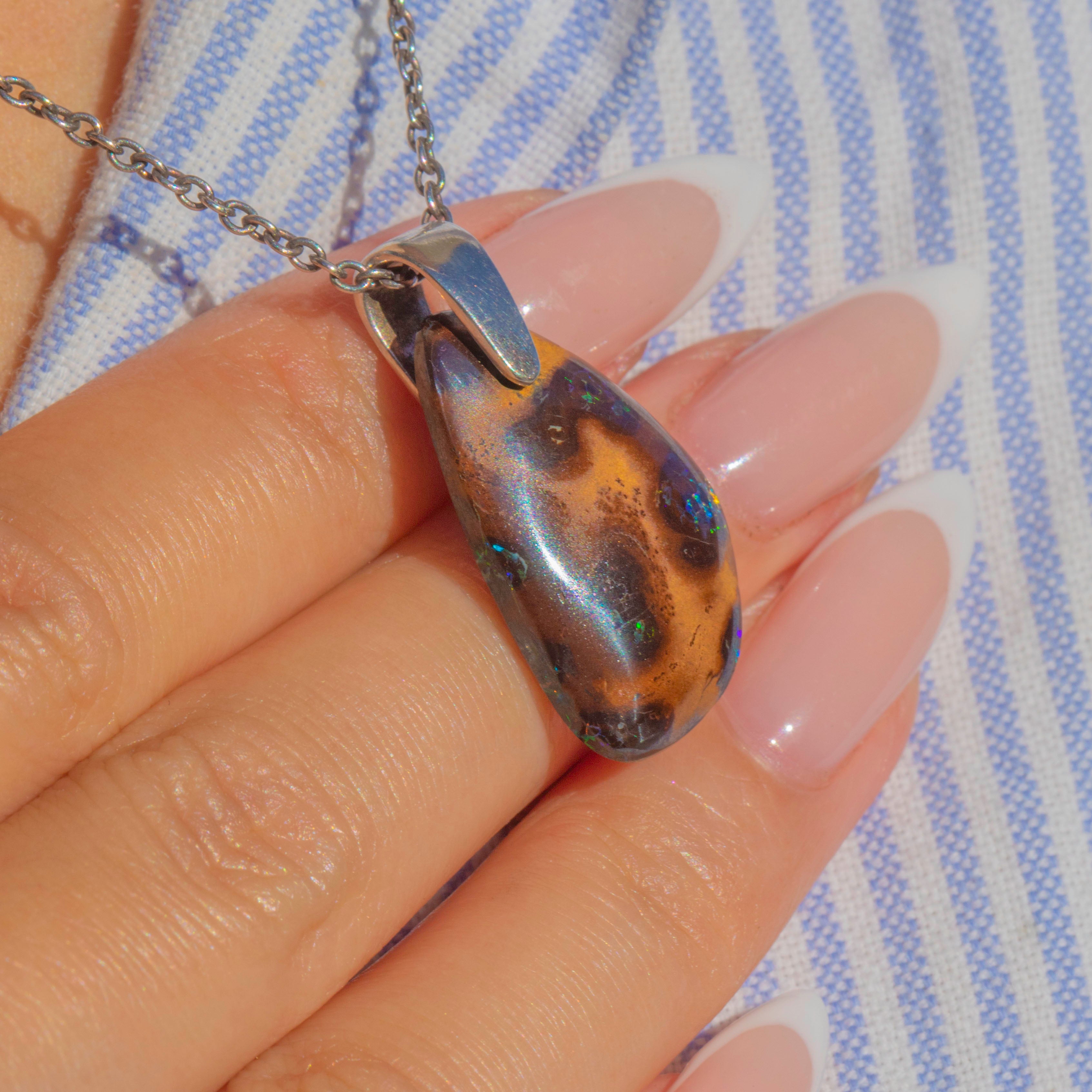 This striking Vintage pendant features a natural Opal Matrix cabochon with flashes of green and blue fire against a rich earthy brown ground. Its organic "bean" shape is smooth and tactile, making it a wonderfully unique and wearable piece of jewellery.