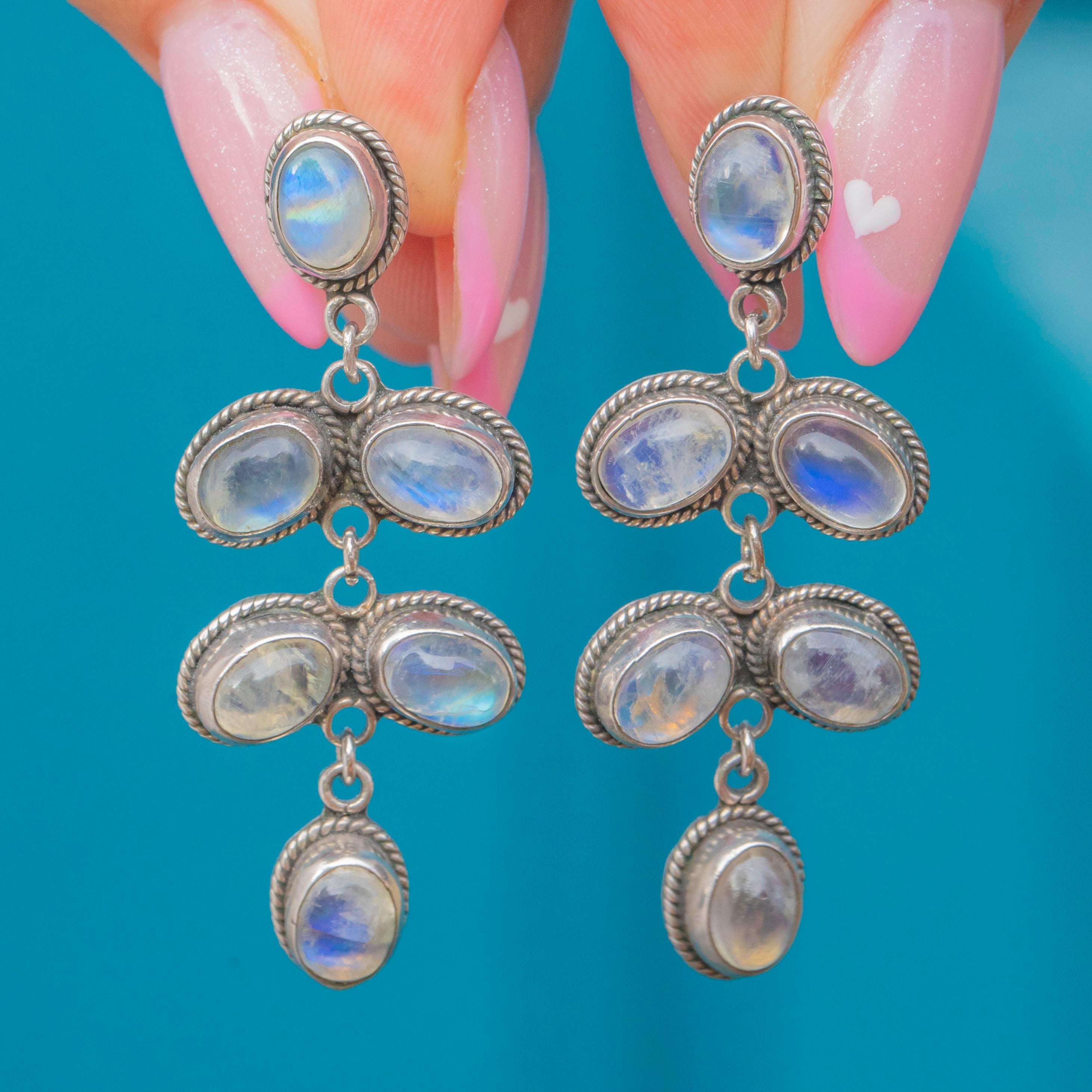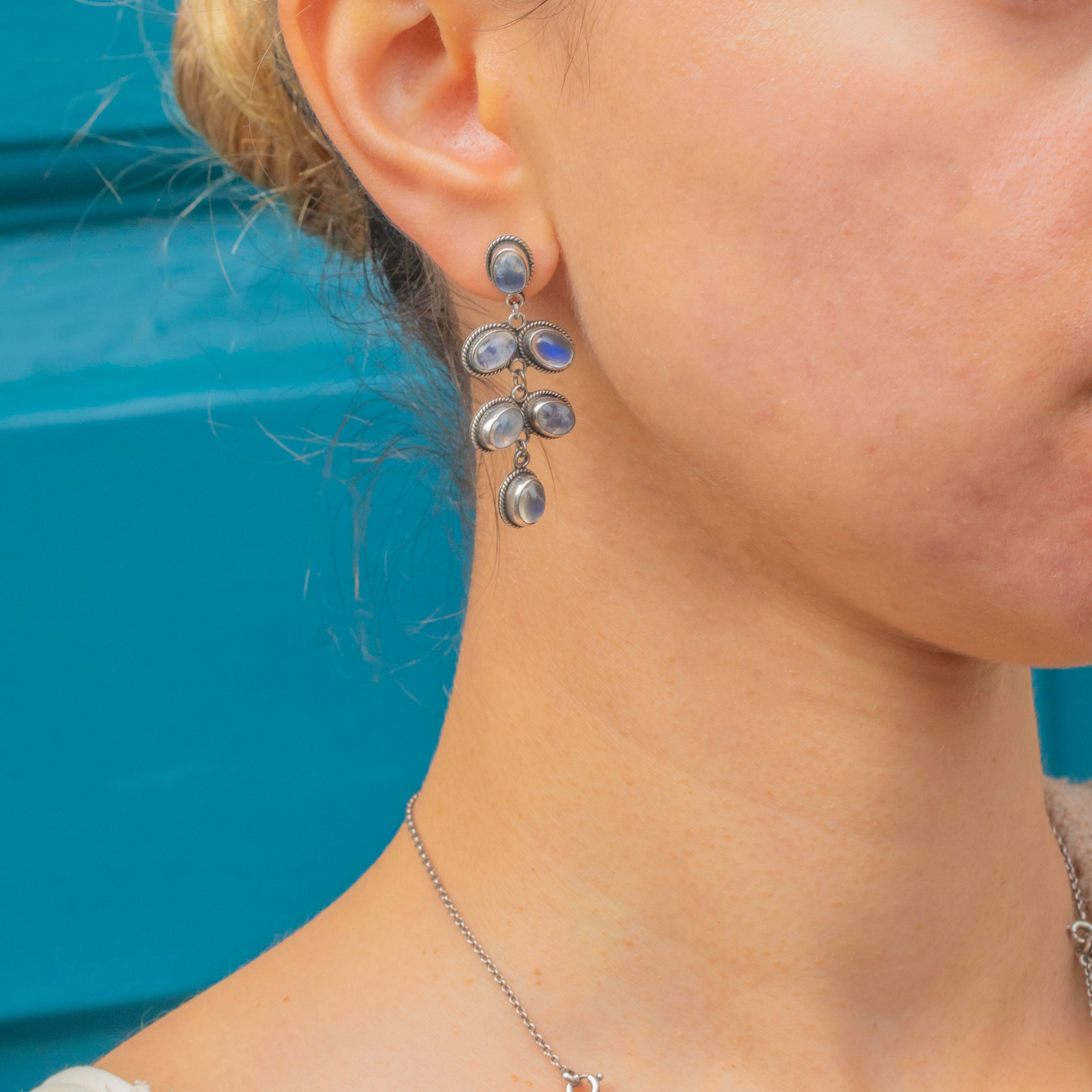 These dreamy Vintage Rainbow Moonstone earrings showcase a cascade of luminous cabochons that flash with blue and rainbow glow at every turn! Elegant in profile yet wonderfully wearable, they bring a touch of celestial shimmer whether styled solo or layered with your favourite Silver pieces.