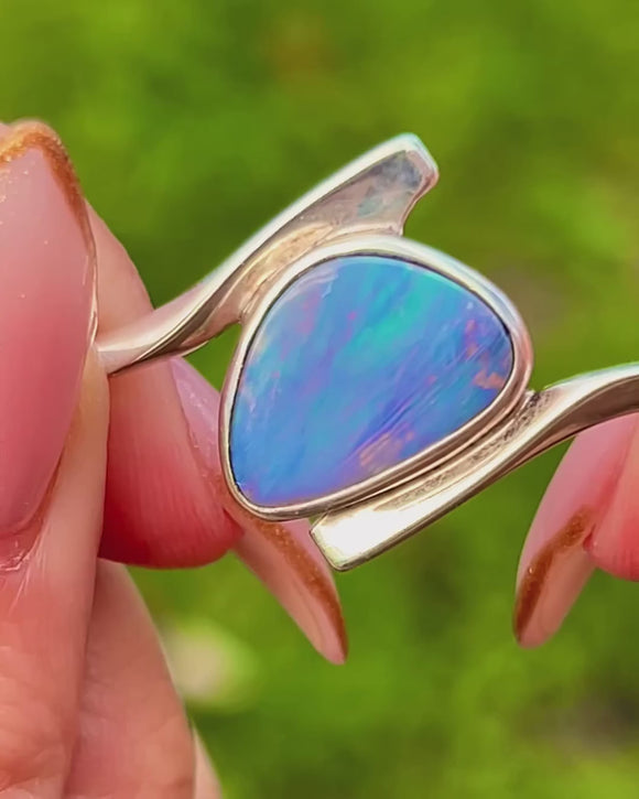 This Vintage Australian Opal doublet pendant has a striking, modernist feel. The Opal doublet is bezel-set on the diagonal, with sweeping Silver curves framing the stone in an open, sculptural design.