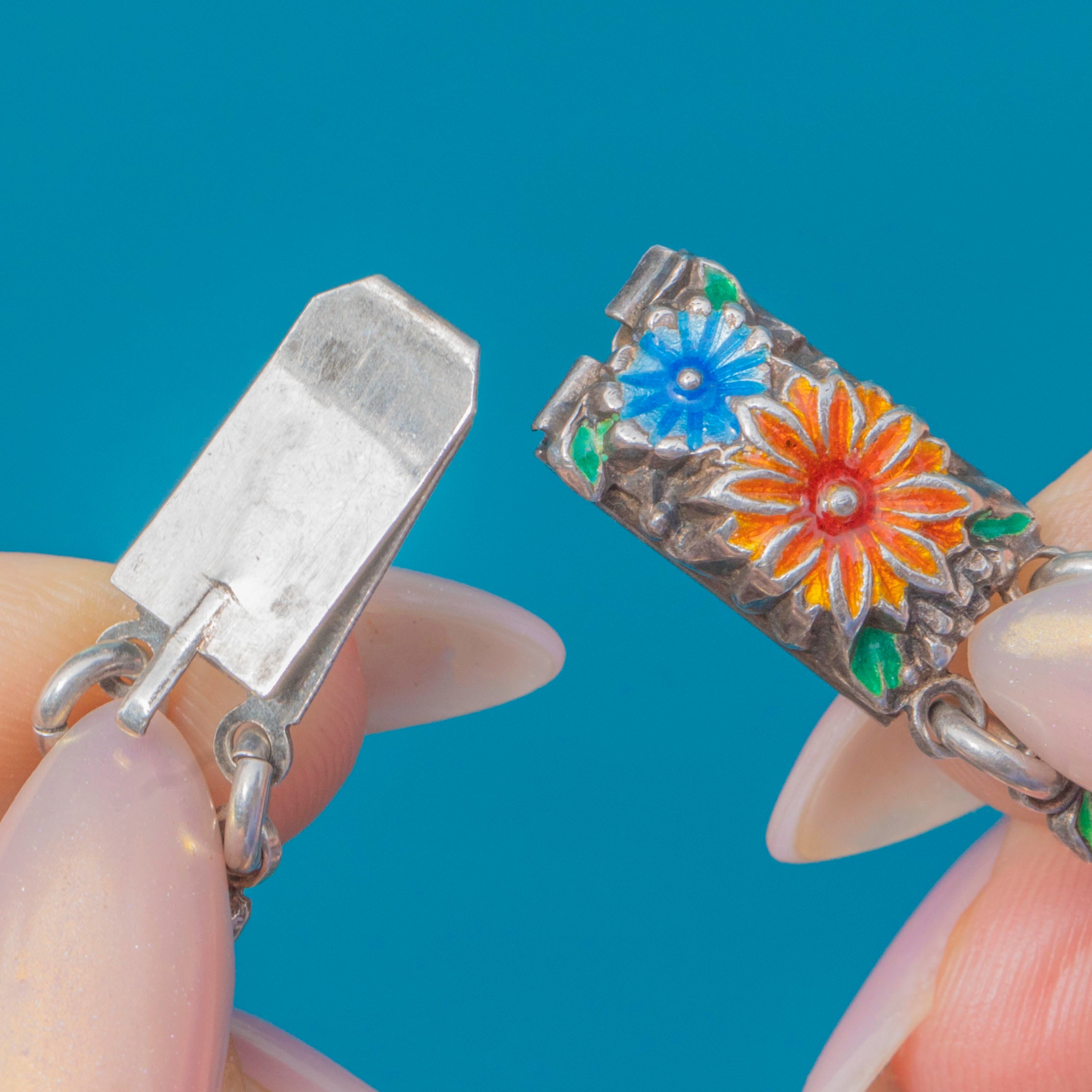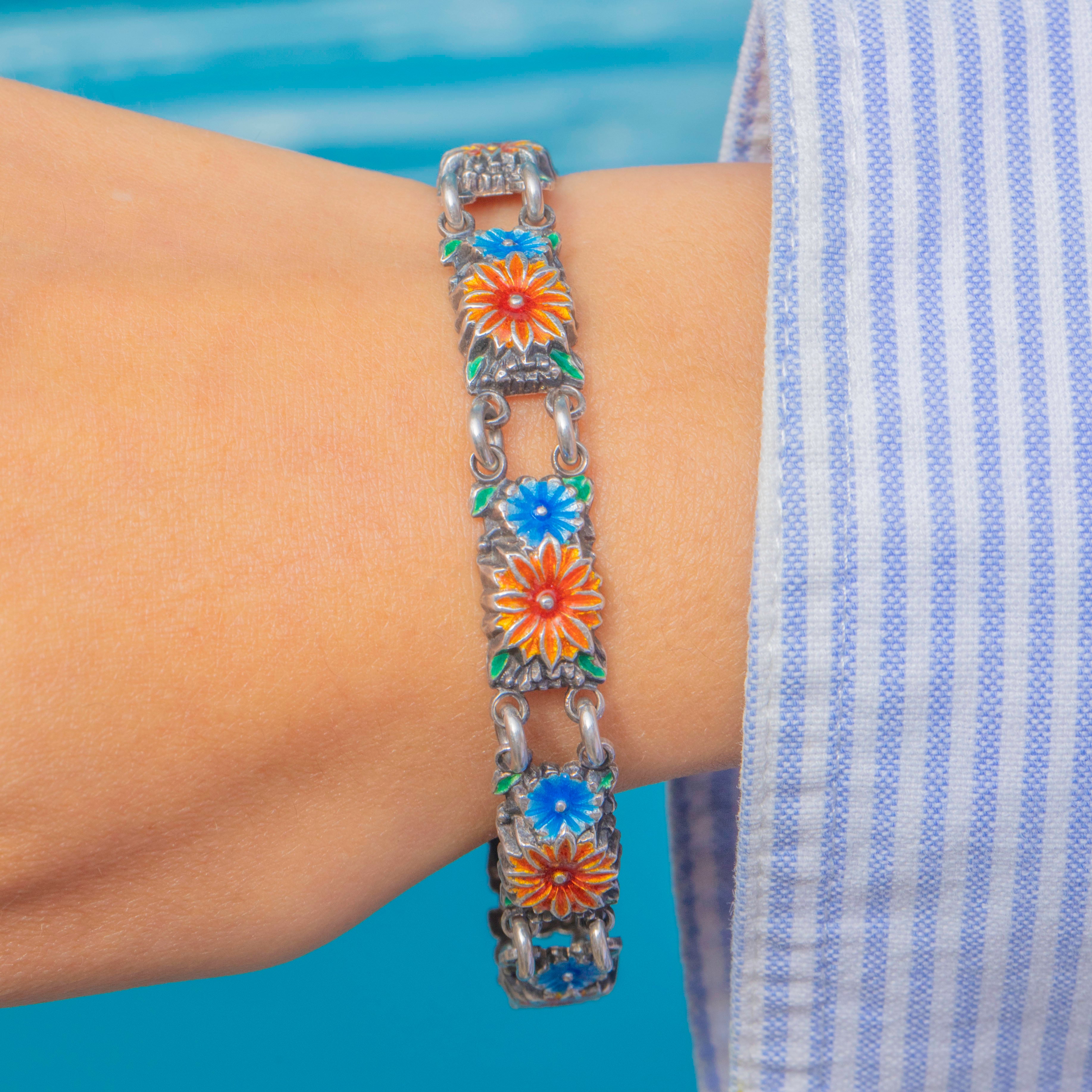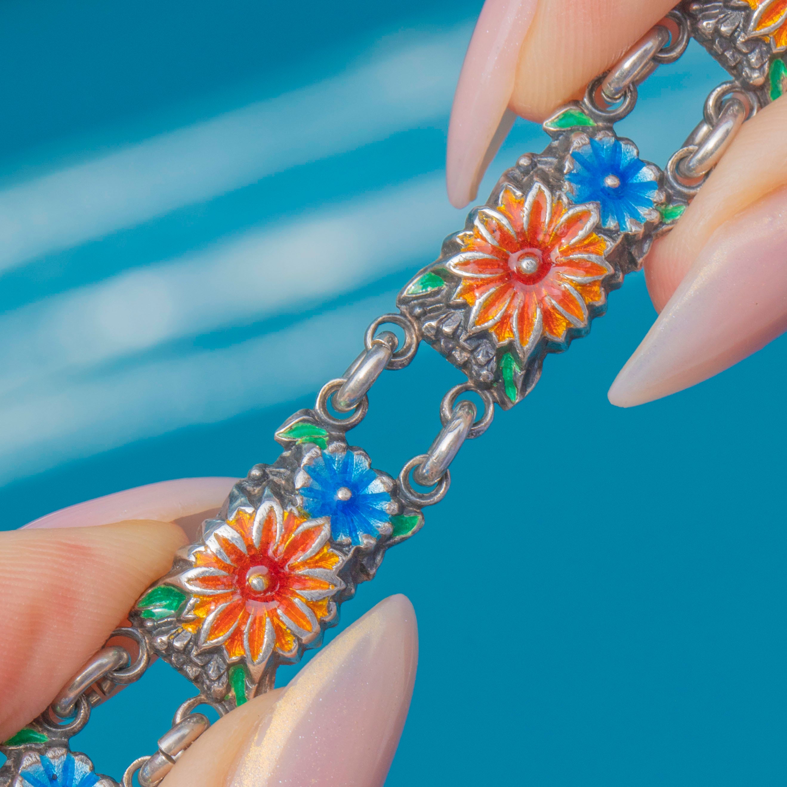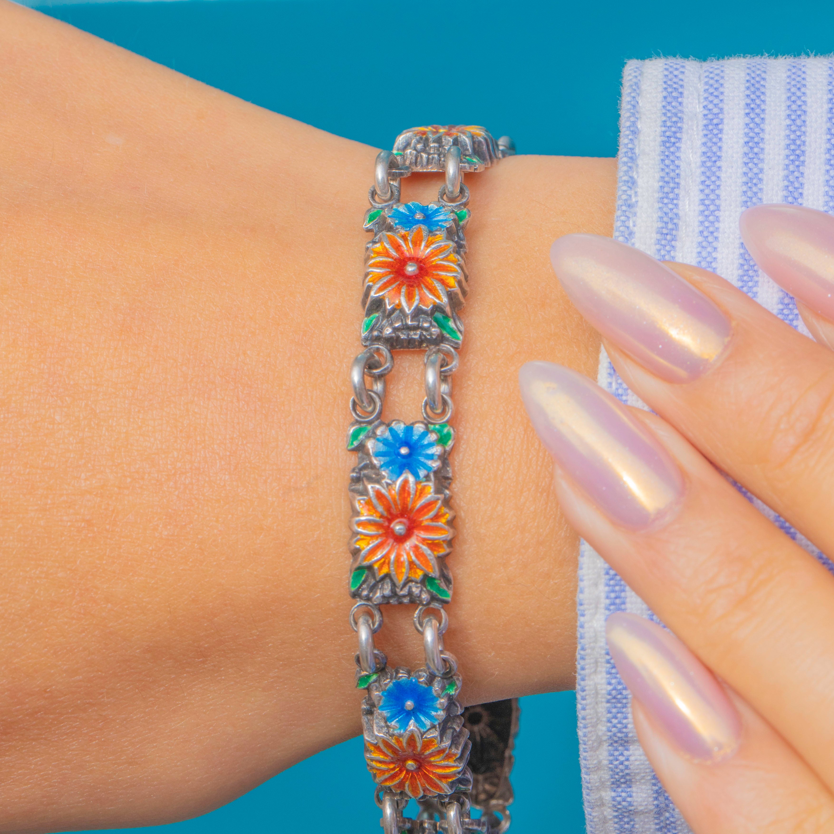 A vibrant Vintage Silver enamel bracelet, decorated with colourful floral motifs across each link. The design features orange-red and soft blue flowers, each framed in green enamel for a charming garden-like effect.