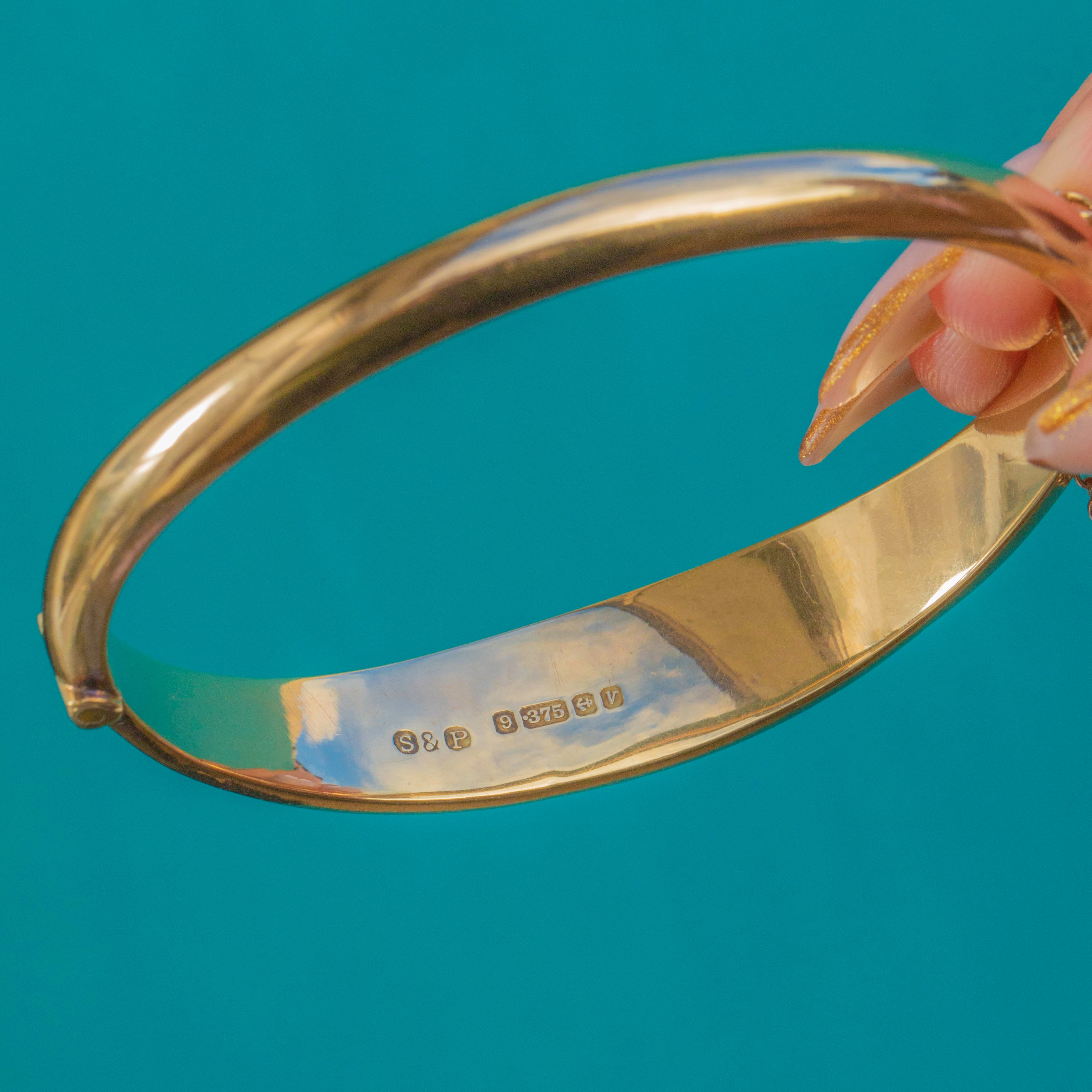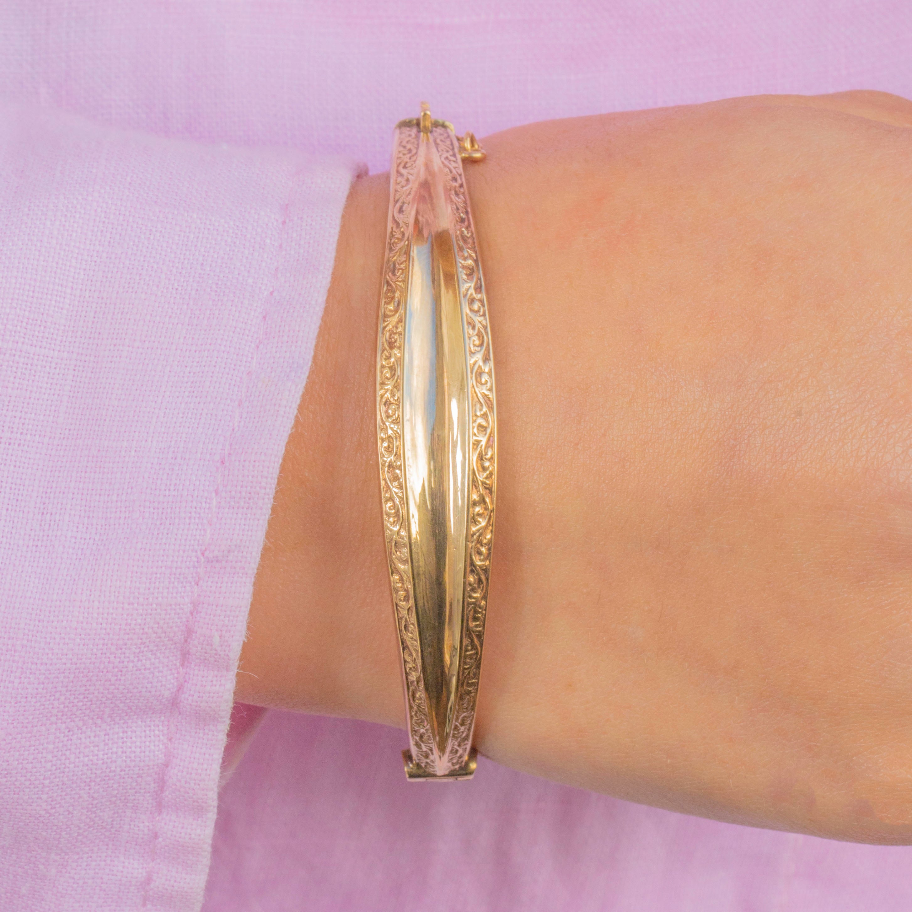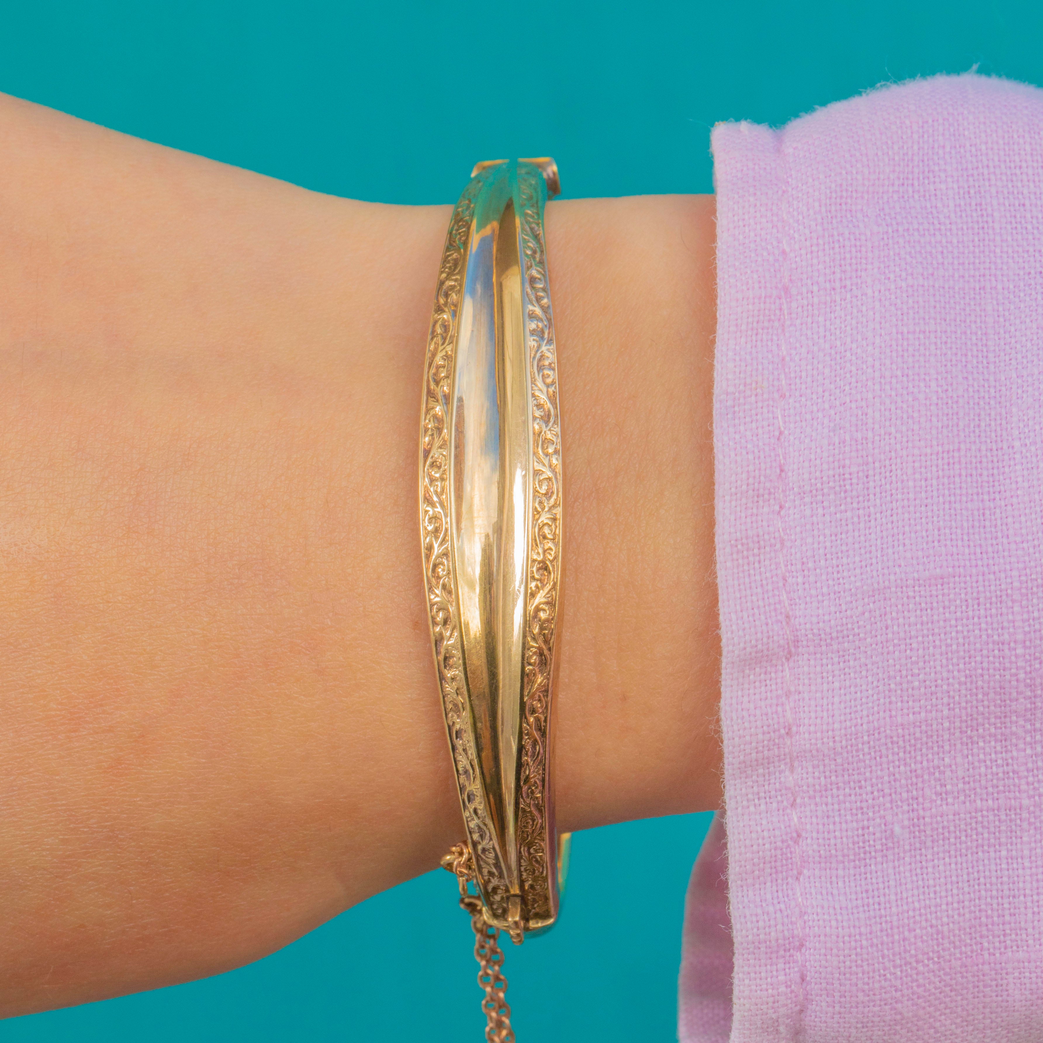 This Vintage solid 9ct Gold bangle is a beautifully wearable classic from 1970. The front is softly domed and richly engraved, giving it a pretty, decorative feel while the back is smooth and comfortable against the wrist.