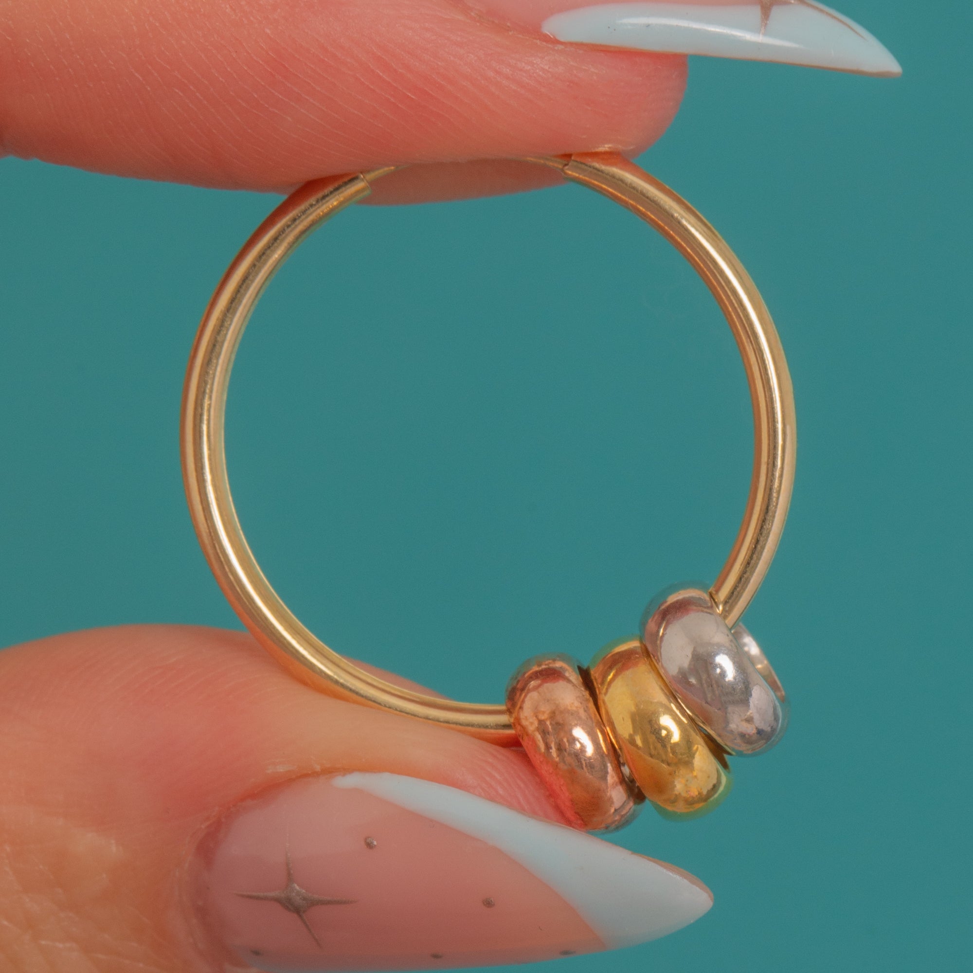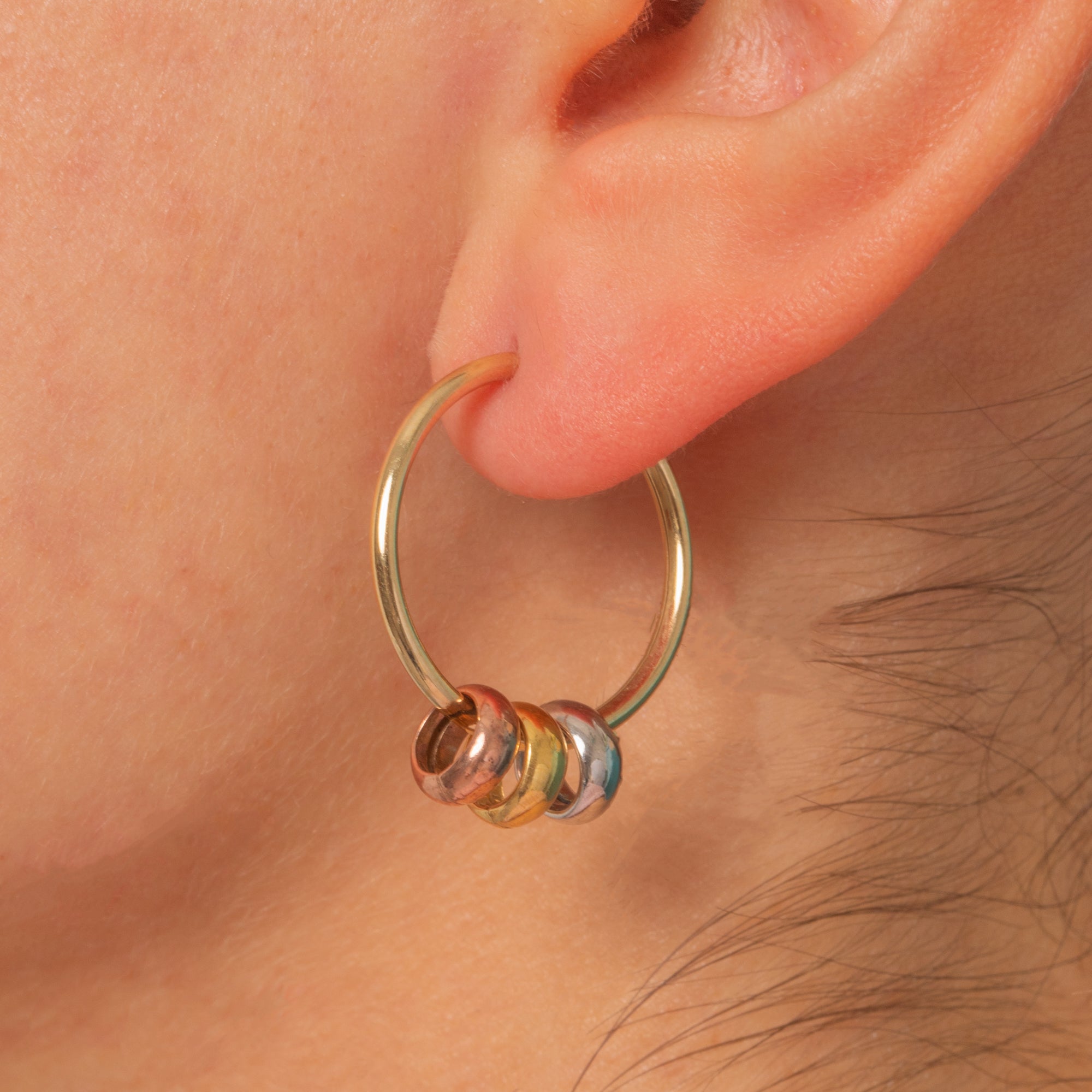 MATERIALS: Tests as 9ct Gold, 9ct Yellow Gold hoops, removable 9ct Yellow Gold, 9ct White Gold and 9ct Rose Gold decorative hoop dangles